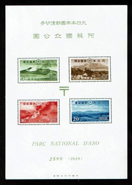 1939年 第1次国立公園切手 阿蘇 小型シート(タトウ付) 糊落ち 未使用