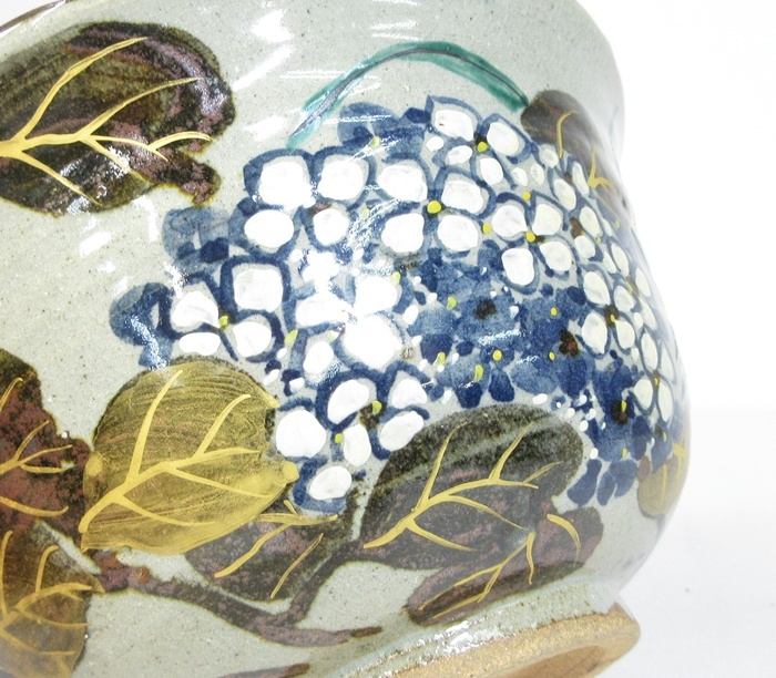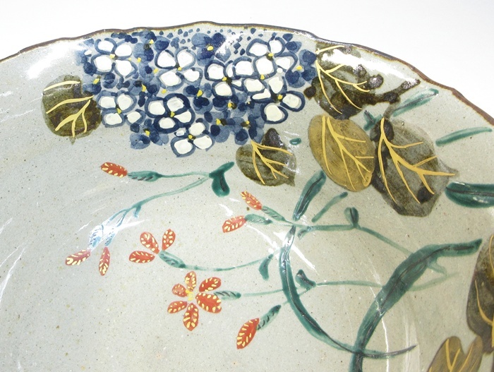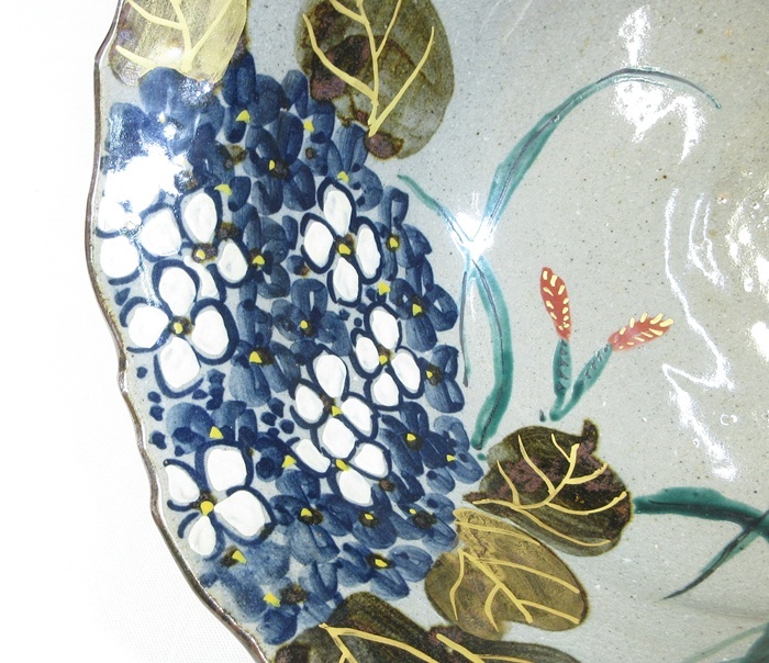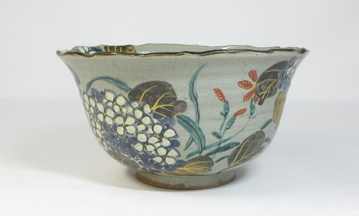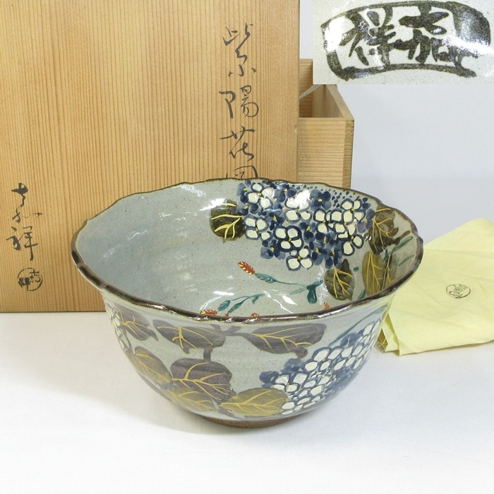【B0569b】京焼【 森岡嘉祥 】作 紫陽花図 鉢 菓子器 菓子鉢 茶道具 共箱 共布 即決 送料込み