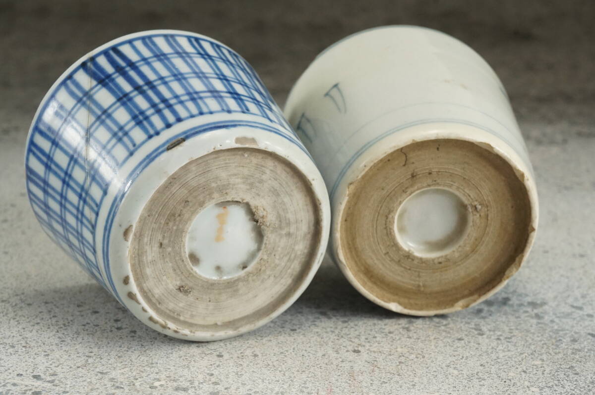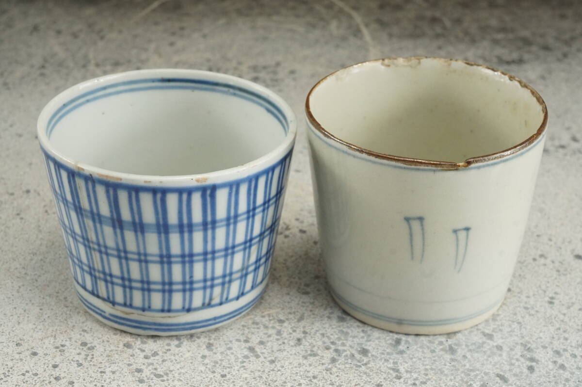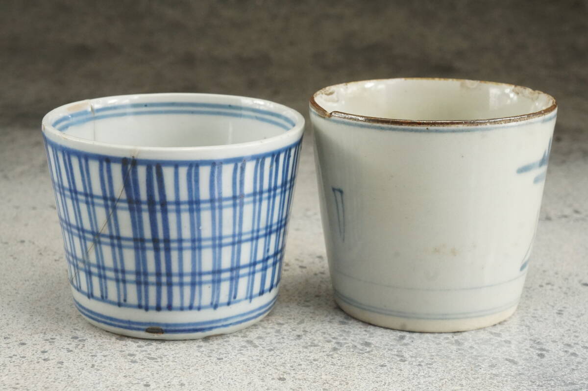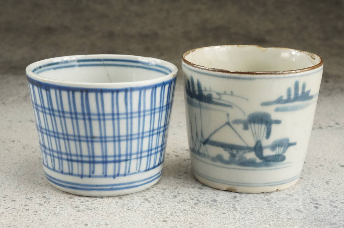 染付そば猪口 山水と格子 蕎麦猪口 二客まとめて 7.2cmx6.5cm、7.5cmx5.7cm 伊万里古伊万里蛇の目草花ちょくちょこ