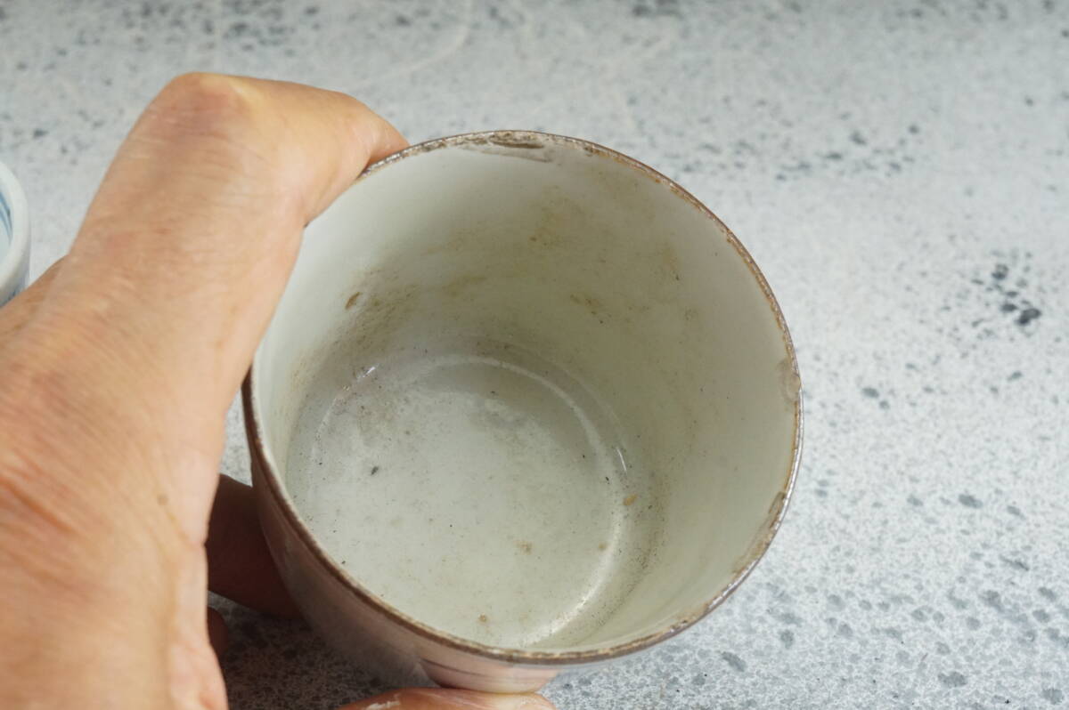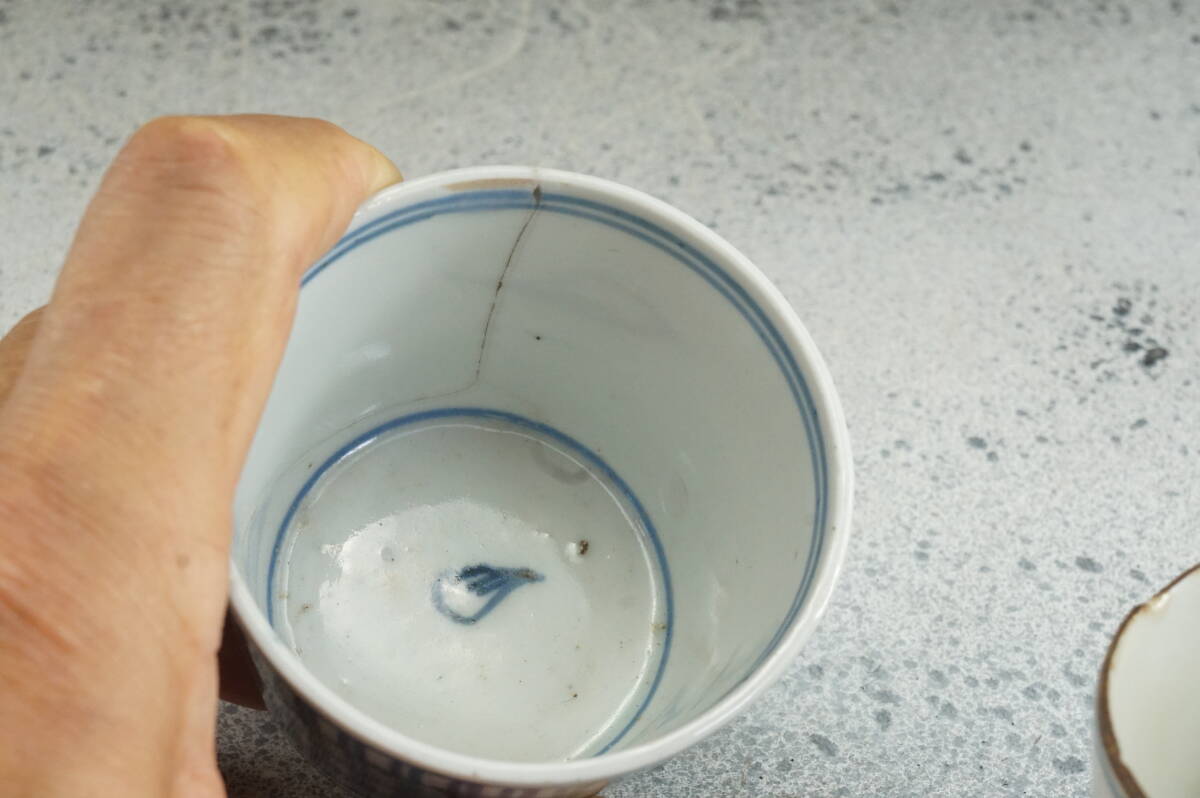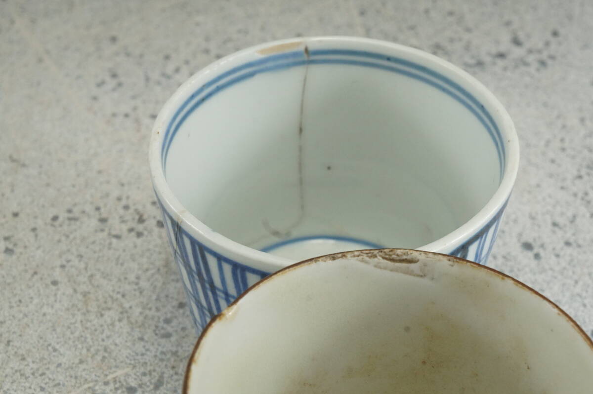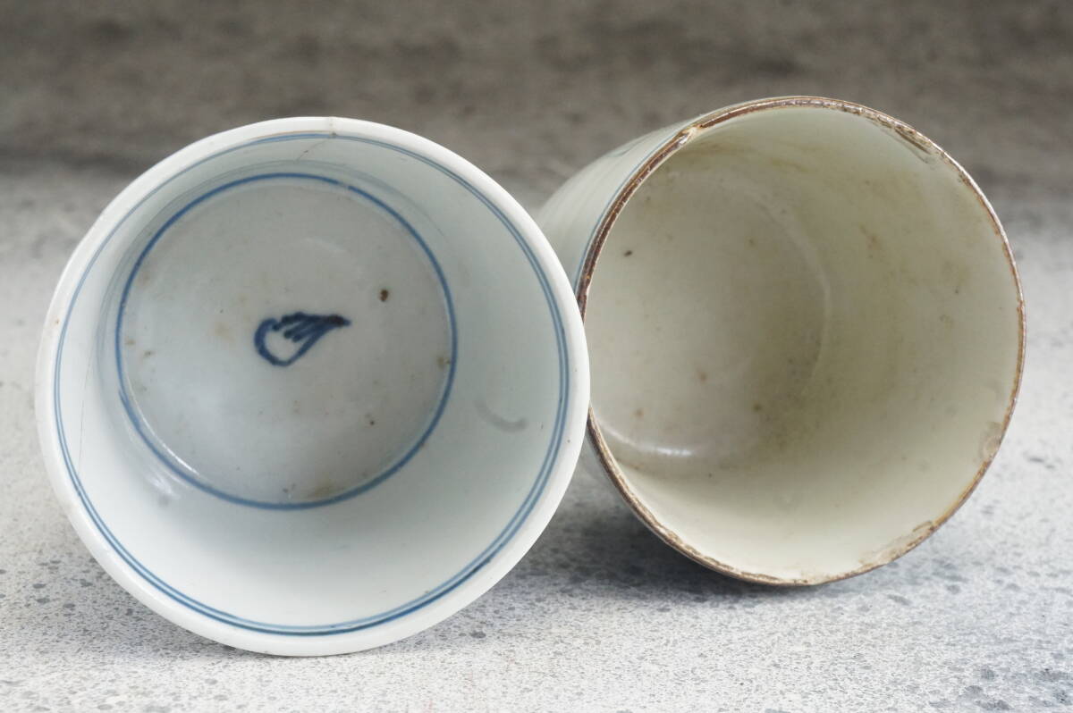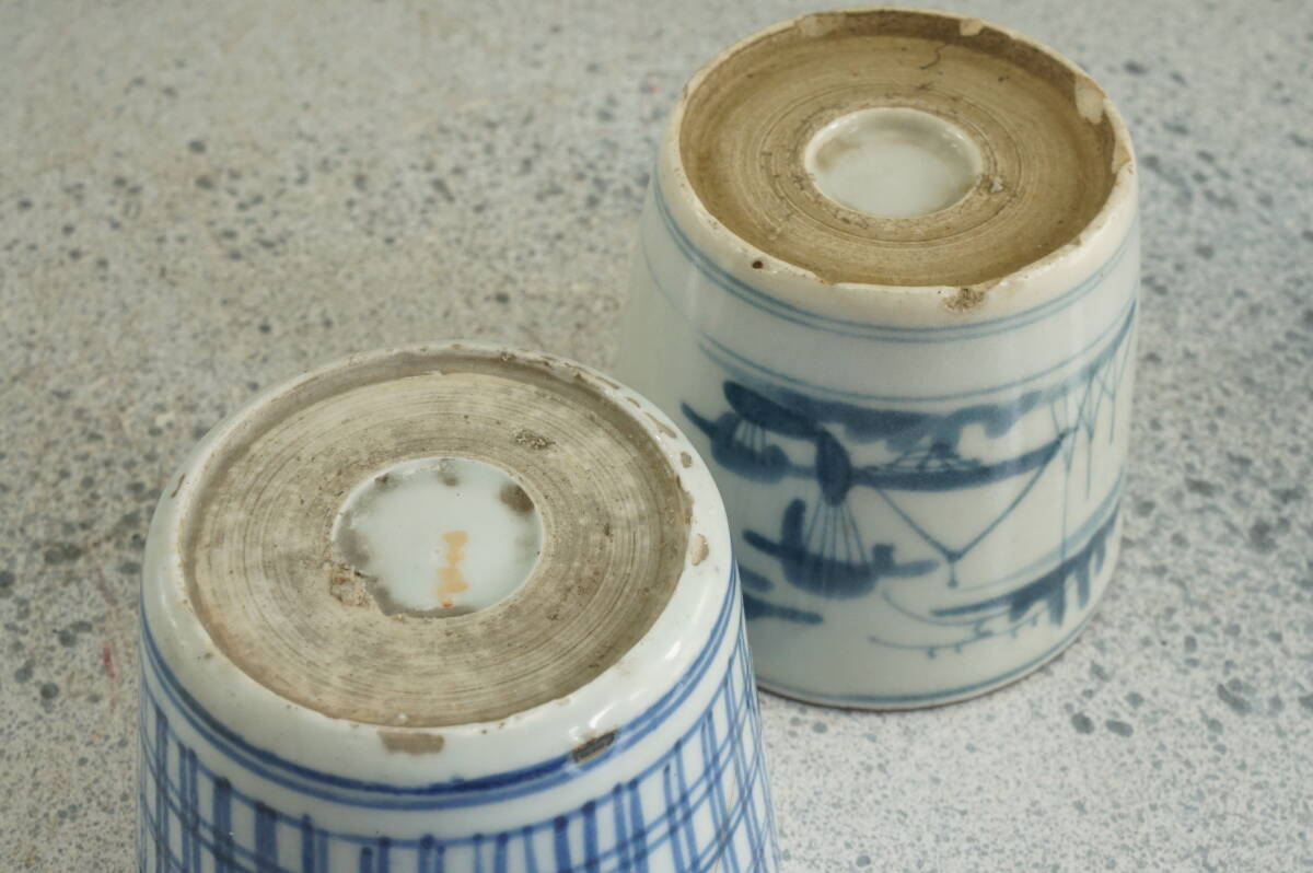 染付そば猪口 山水と格子 蕎麦猪口 二客まとめて 7.2cmx6.5cm、7.5cmx5.7cm 伊万里古伊万里蛇の目草花ちょくちょこ