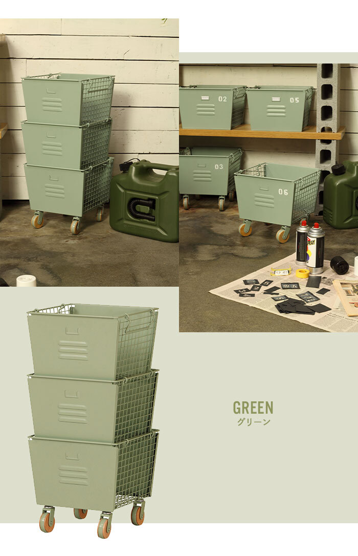| ・スチールロッカーをイメージしたような無骨なBOXが3つセットになっています。 ・キャスターに天然木をあしらい、細部までこだわったシンプルながらかわいいデザイン。 ・ラベルホルダー付きで分別収納に便利。 ・サイドと底面はメッシュ状になっていて通気性も抜群なので食材のストックにもぴったり。 ・取手を折り畳めばスタッキングも可能。 ・下段のBOXにはキャスター付き。 ・バスケットの左右にはハンドル付きで持ち運びもラクラク。 |