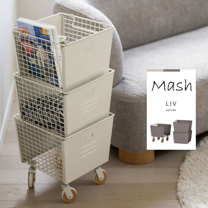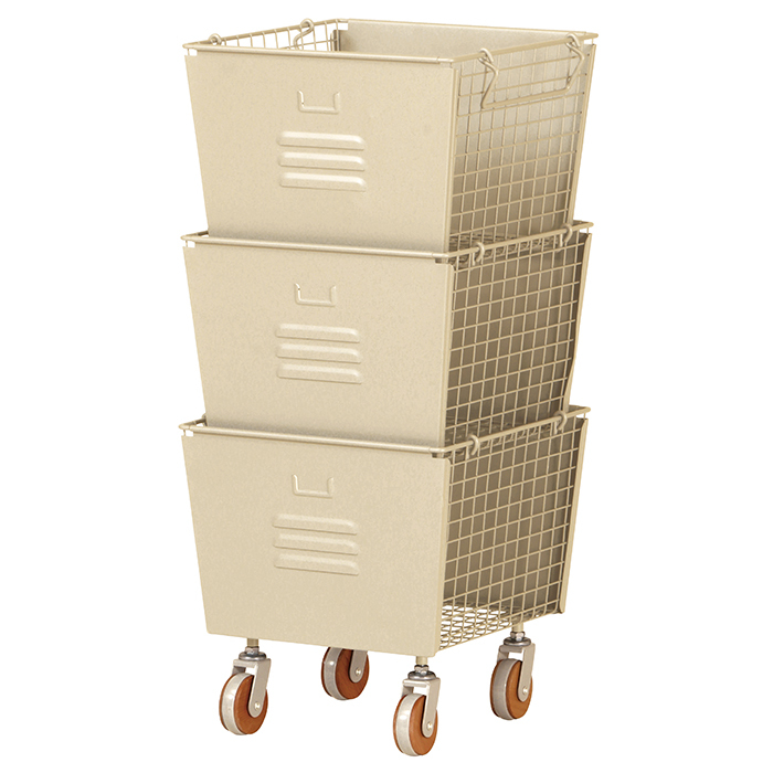 | スチールロッカーをイメージしたような無骨なデザインのバスケットワゴンです。 同じサイズのBOXが3つセットになっています。 キャスターに天然木をあしらい、細部までこだわったシンプルながらかわいいデザインです。 用途に合わせてリビング、ランドリー、キッチンや子供部屋など、様々なシーンでお使いいただけます。 サイドと底面はメッシュ状になっていて通気性も抜群なので食材のストックにもぴったり。 取手を折り畳めばスタッキングも可能なので、省スペースに収納できます。 下段のBOXにはキャスターが付いているので重いものを収納しても移動がラクラクです。 バスケットの左右にはハンドルが付いているので持ち運びにも便利です。 |