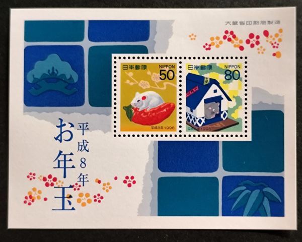 [25090602] 年賀切手【お年玉小型シート 平成8年】子「唐辛子乗りねずみ 堤人形・米倉ねずみ 薩摩首人形」41+62円 1996年発行 美品