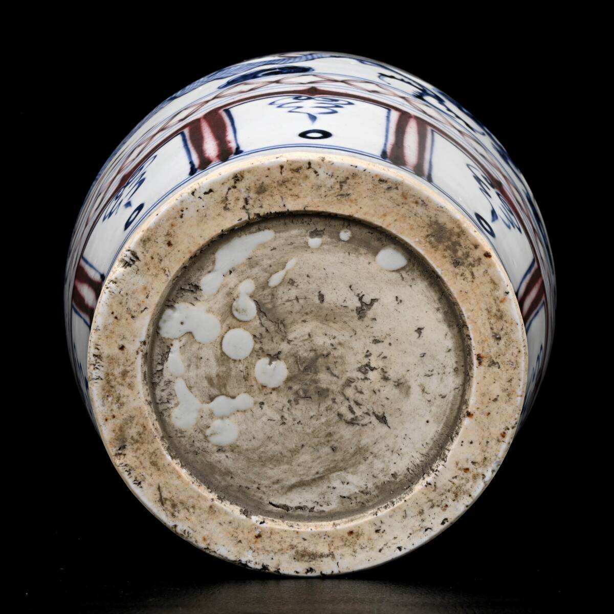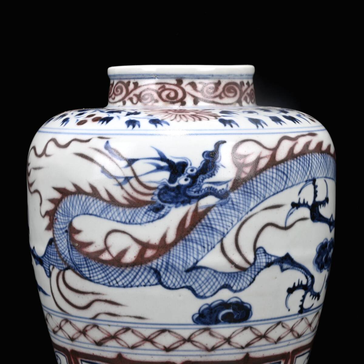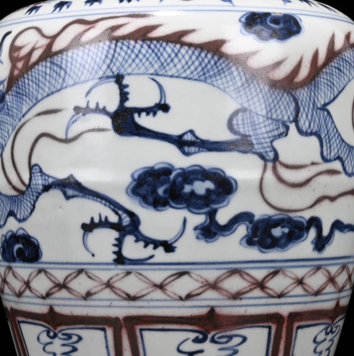 FL8401:9人間国宝 中国骨董 磁器【青釉に紅龍紋の壺】工芸品 施釉陶 青花磁 陶芸 本物 古美術 旧蔵 珍品