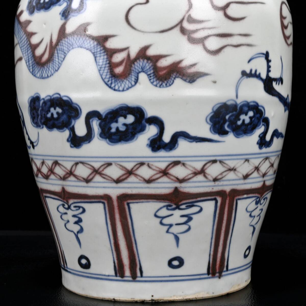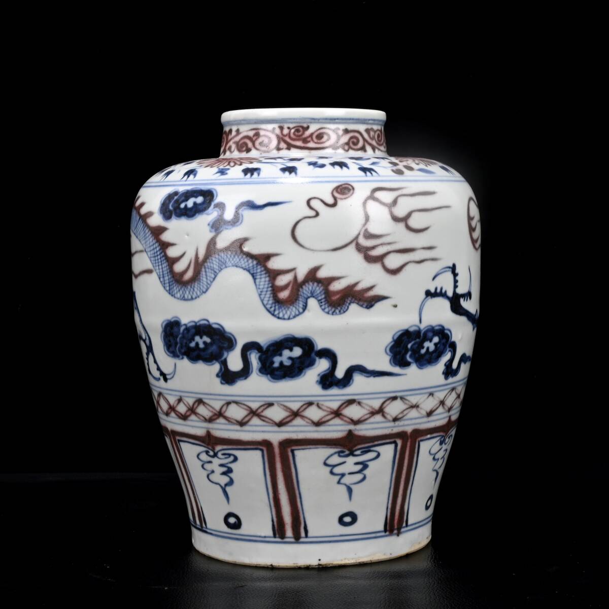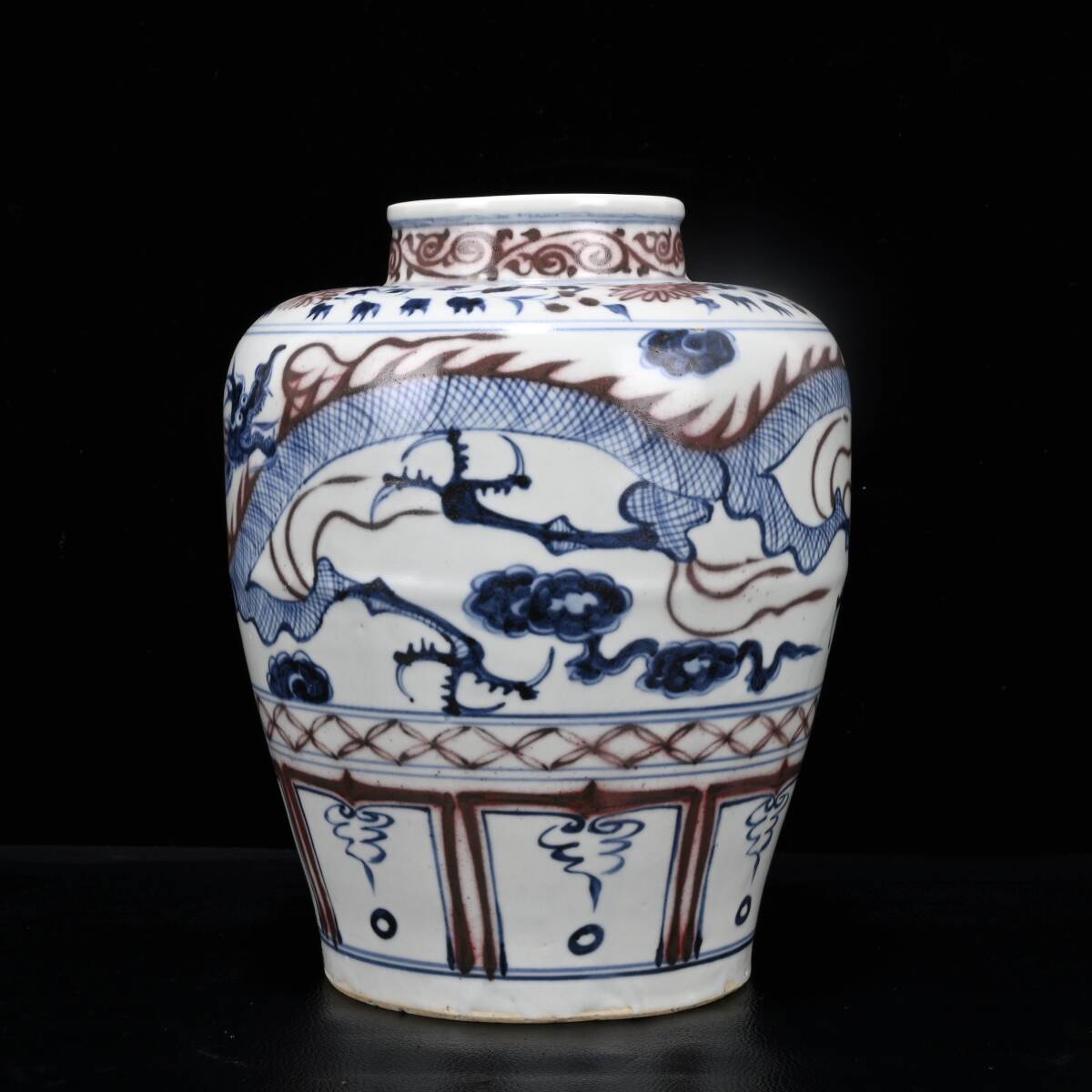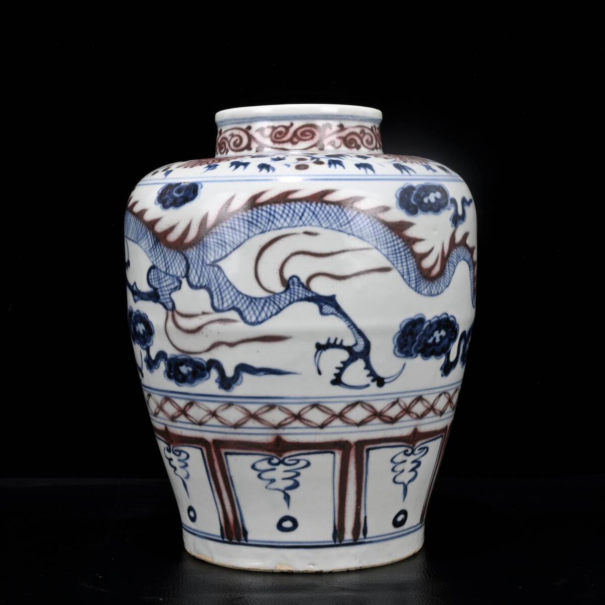 中国骨董 磁器【青釉に紅龍紋の壺】工芸品 施釉陶 青花磁 陶芸 本物 古美術 旧蔵 珍品