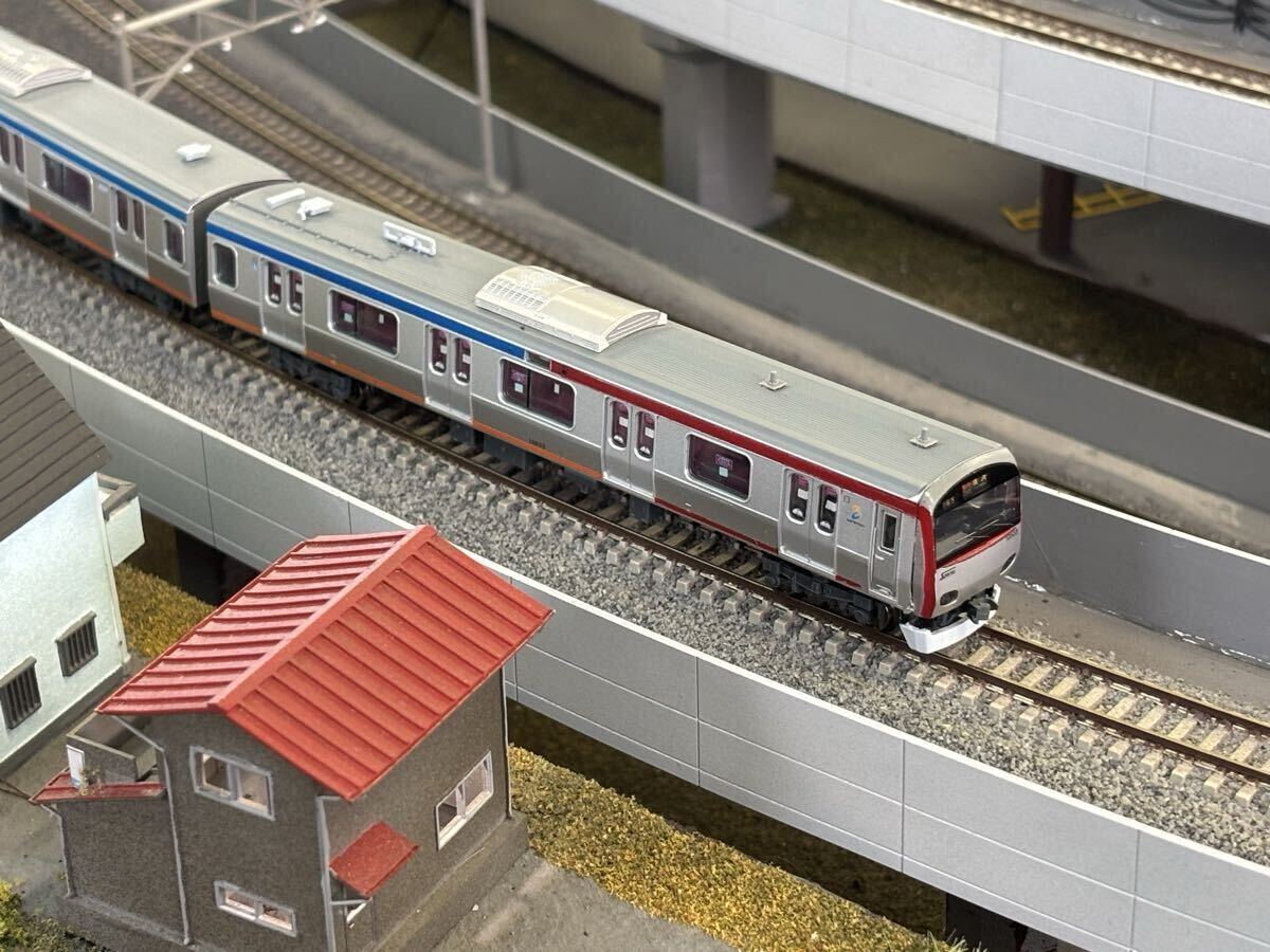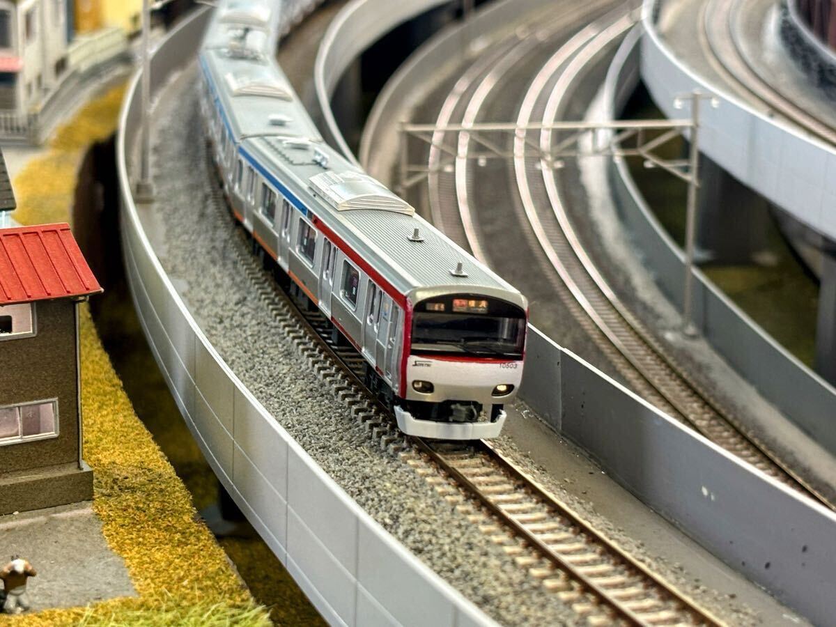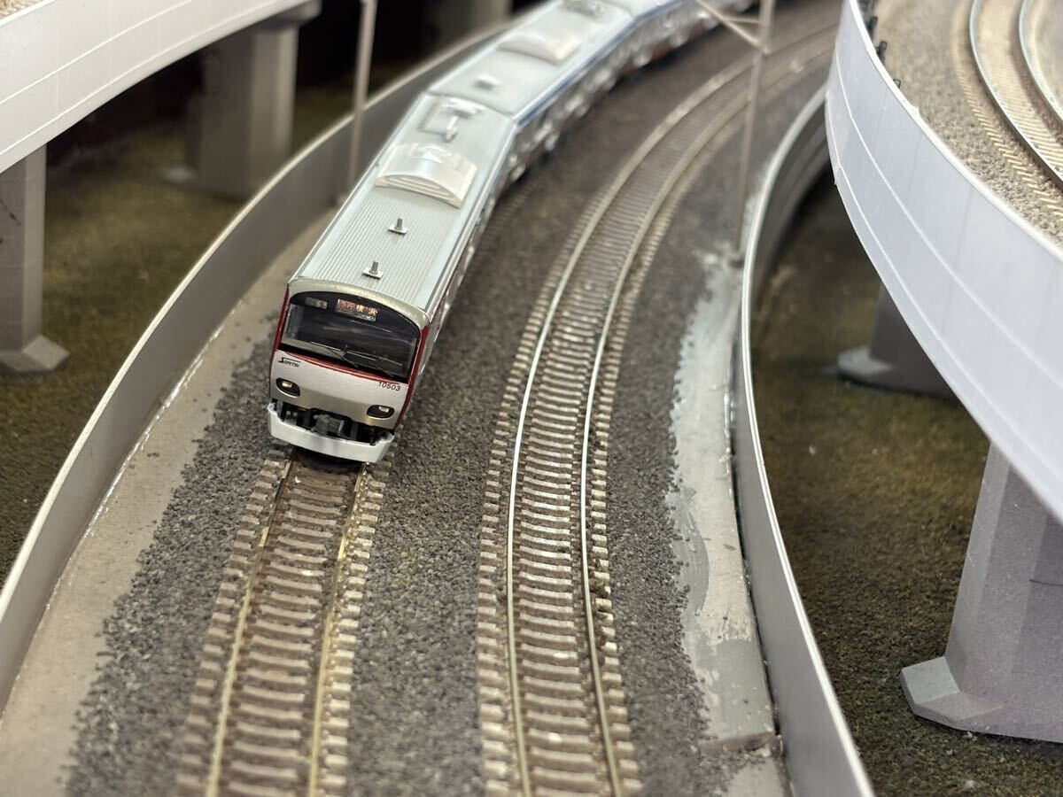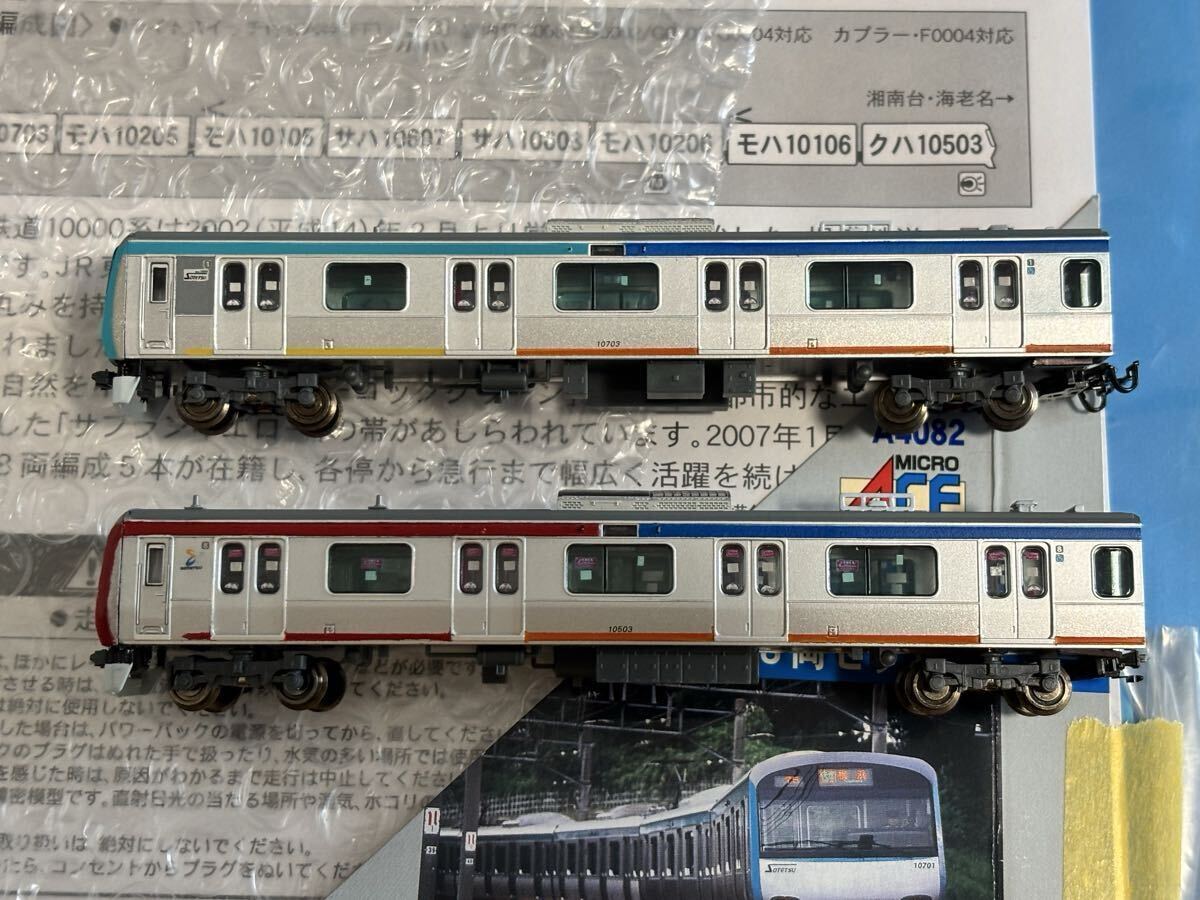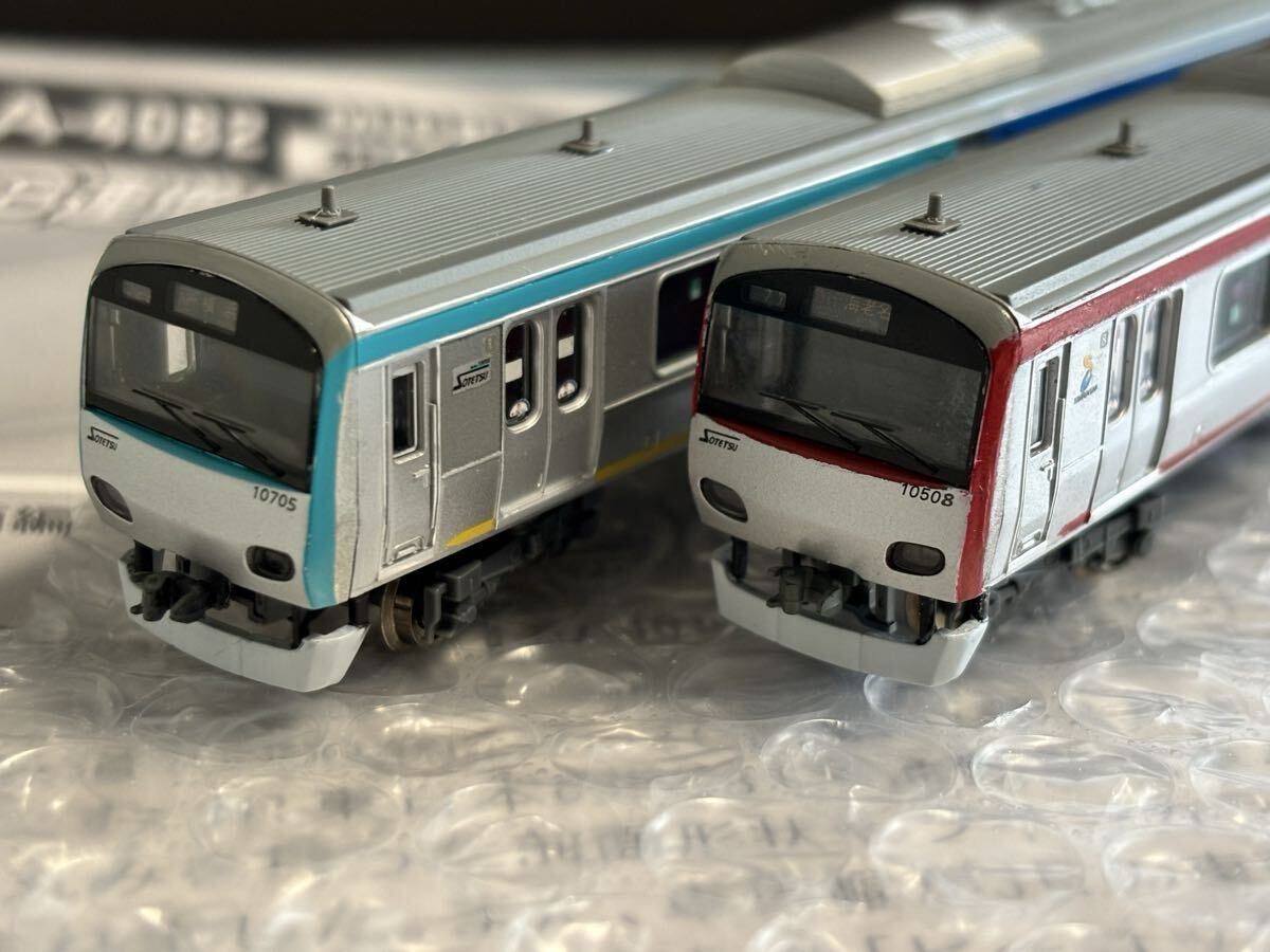 中古で購入したマイクロエース製 相鉄10000系を加工し、懐かしの若草色と往年の赤帯色の車両を両先頭車を塗装し直すことで再現しました。