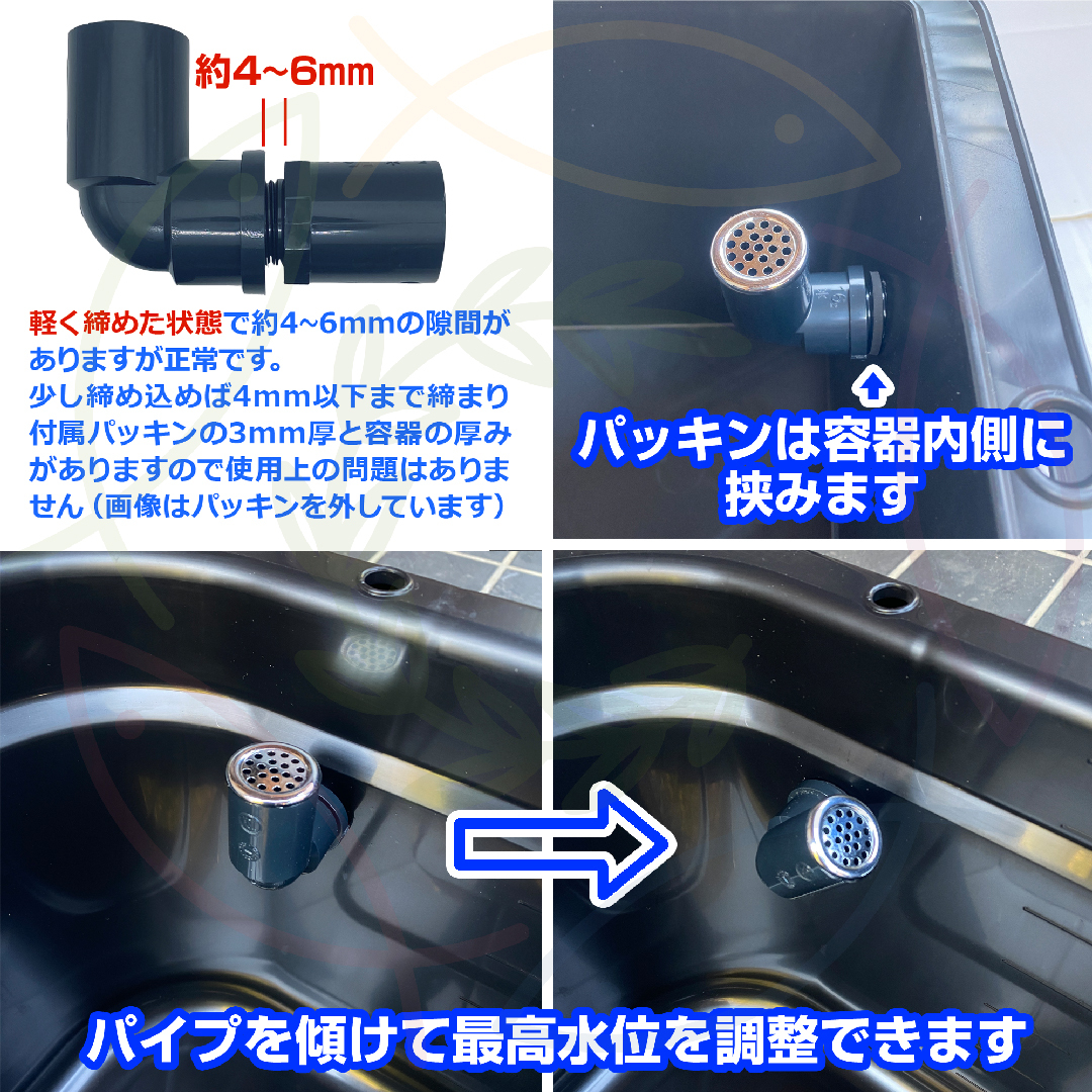 充分な口径を得る為、呼び径16(内径約22mm)を使用しています。 パイプ色は、本体黒の場合黒に近い濃い群青色、本体白・灰の場合灰色です。 流出防止キャップはメッキです。