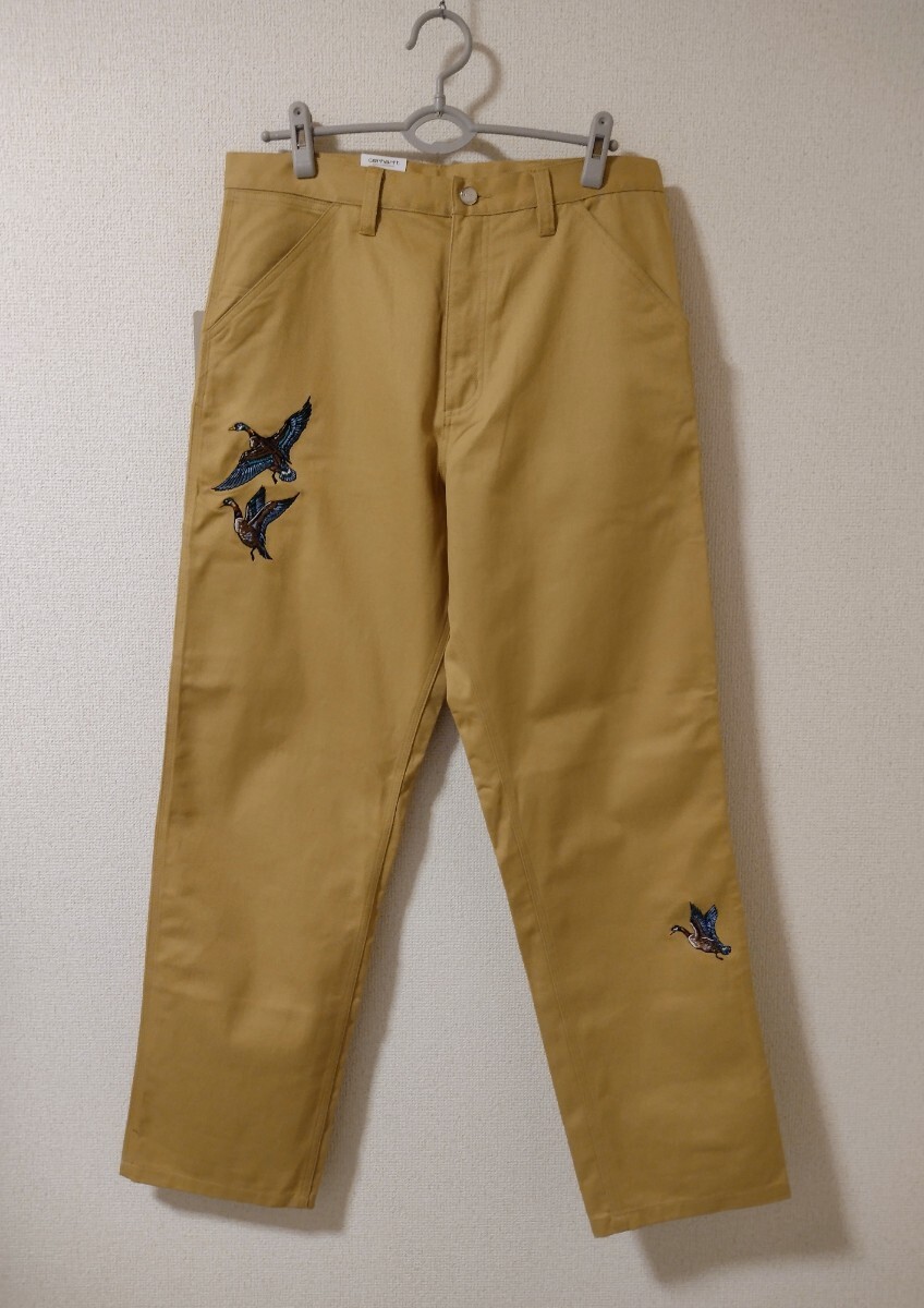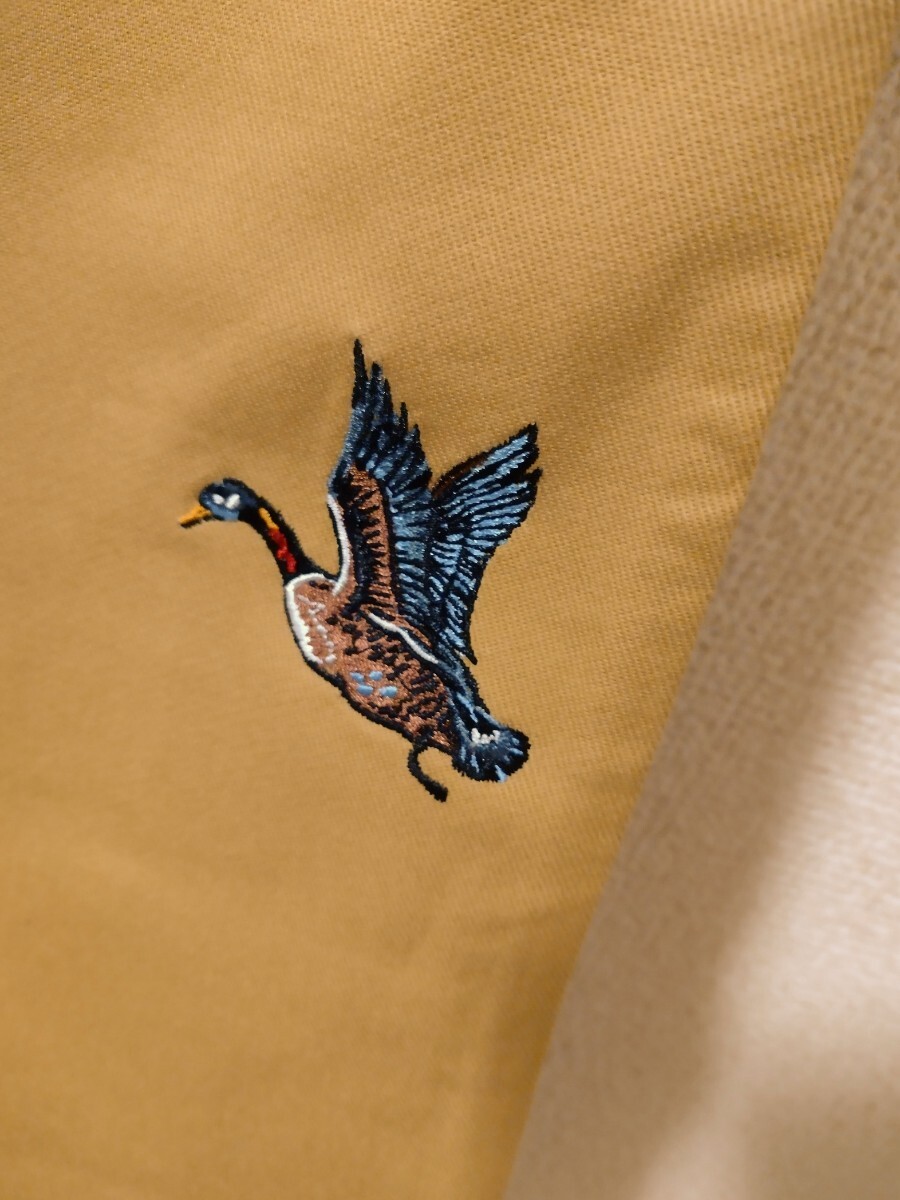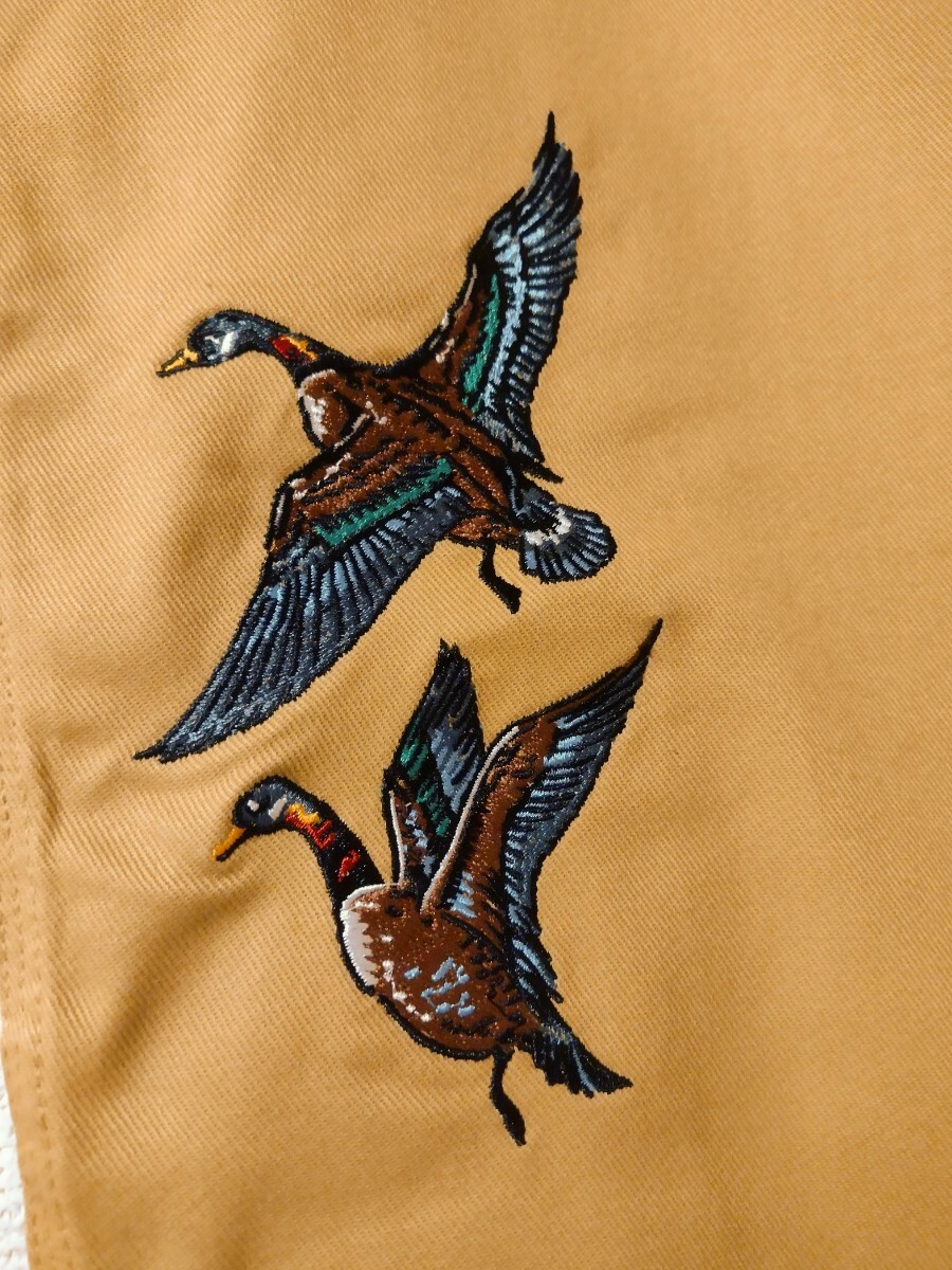 躍動感のある鳥、犬の刺繍は芸術的なデザインで、着用時にそれらの刺繍が揺れ動く様が、抜群の存在感を生み出します。8.7オンスのツイル生地は、適度な厚みがあるので、動き易く秋頃から確実に重宝するでしょう。