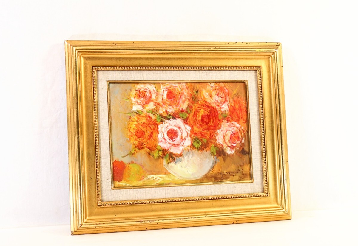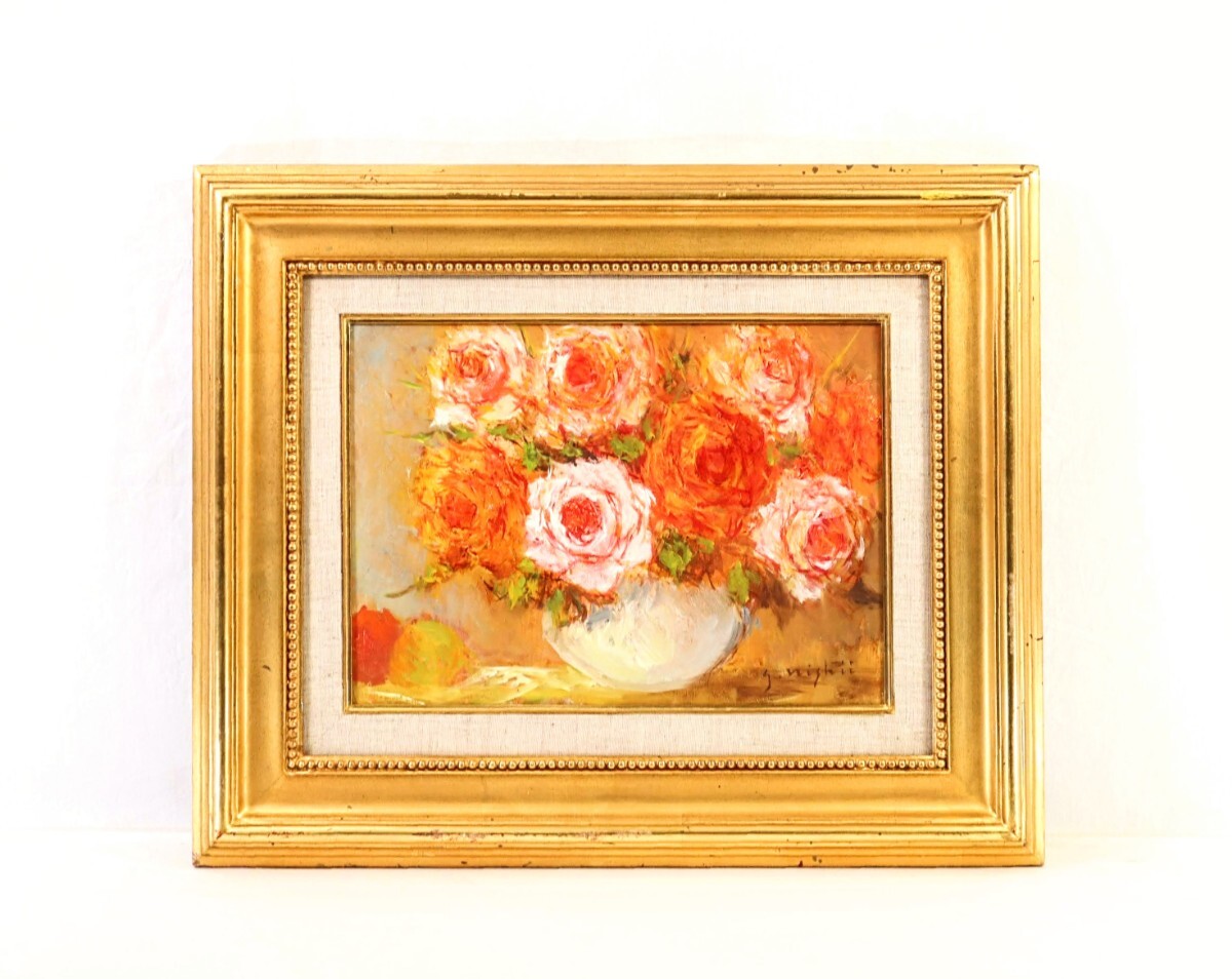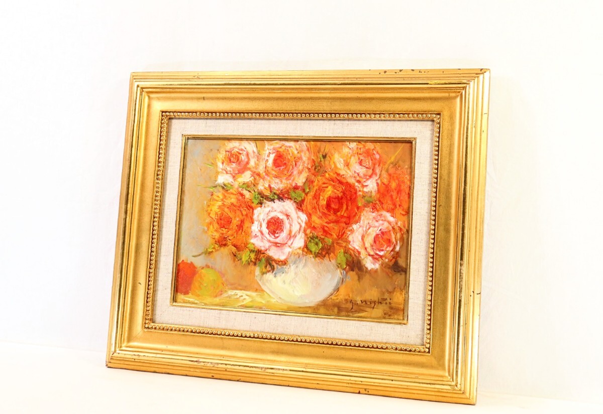 真作 西井義晃 油彩「薔薇」画寸 F4 大阪府出身 元自由美術協会会員 温かみのある色調で華やかに咲き誇るバラの花々 幸福感届ける 9724