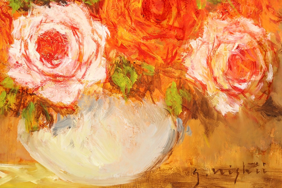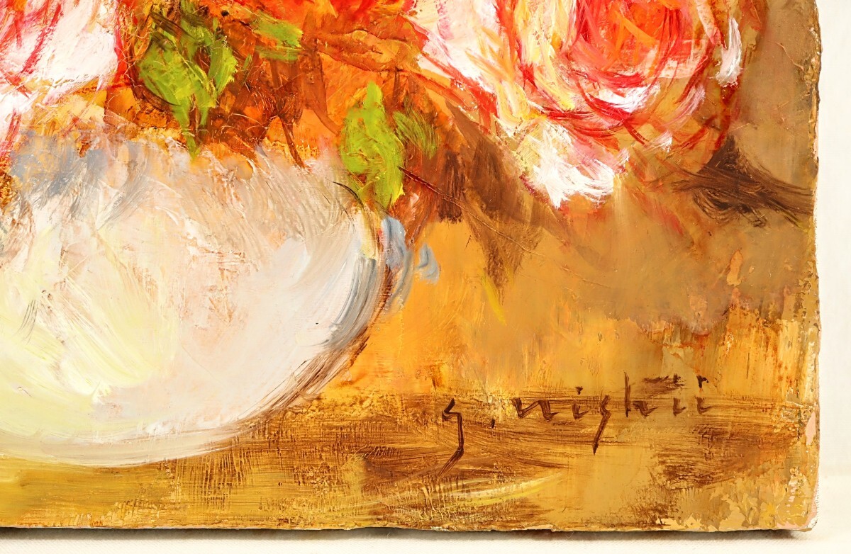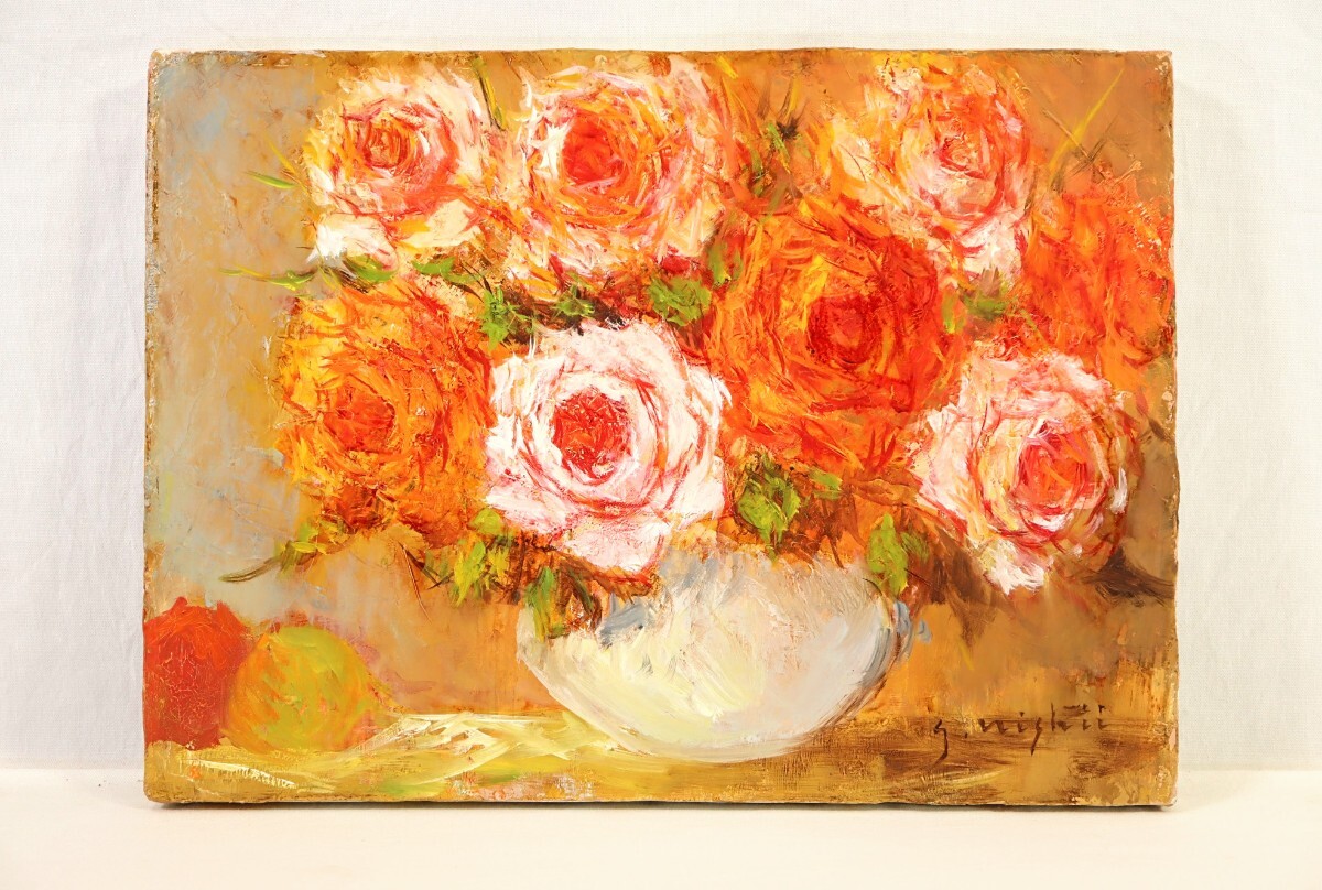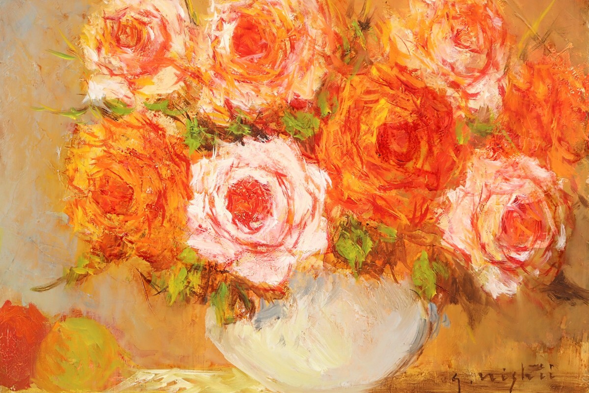 真作 西井義晃 油彩「薔薇」画寸 F4 大阪府出身 元自由美術協会会員 温かみのある色調で華やかに咲き誇るバラの花々 幸福感届ける 9724