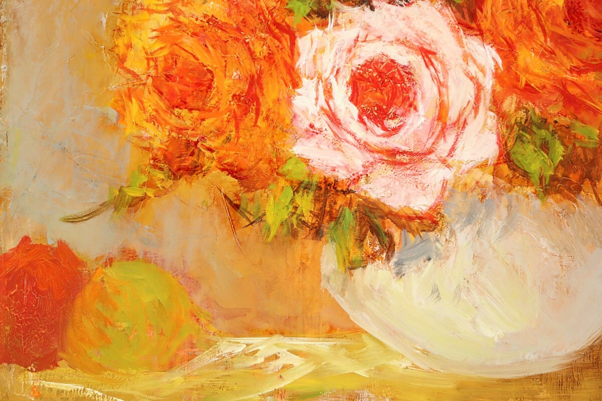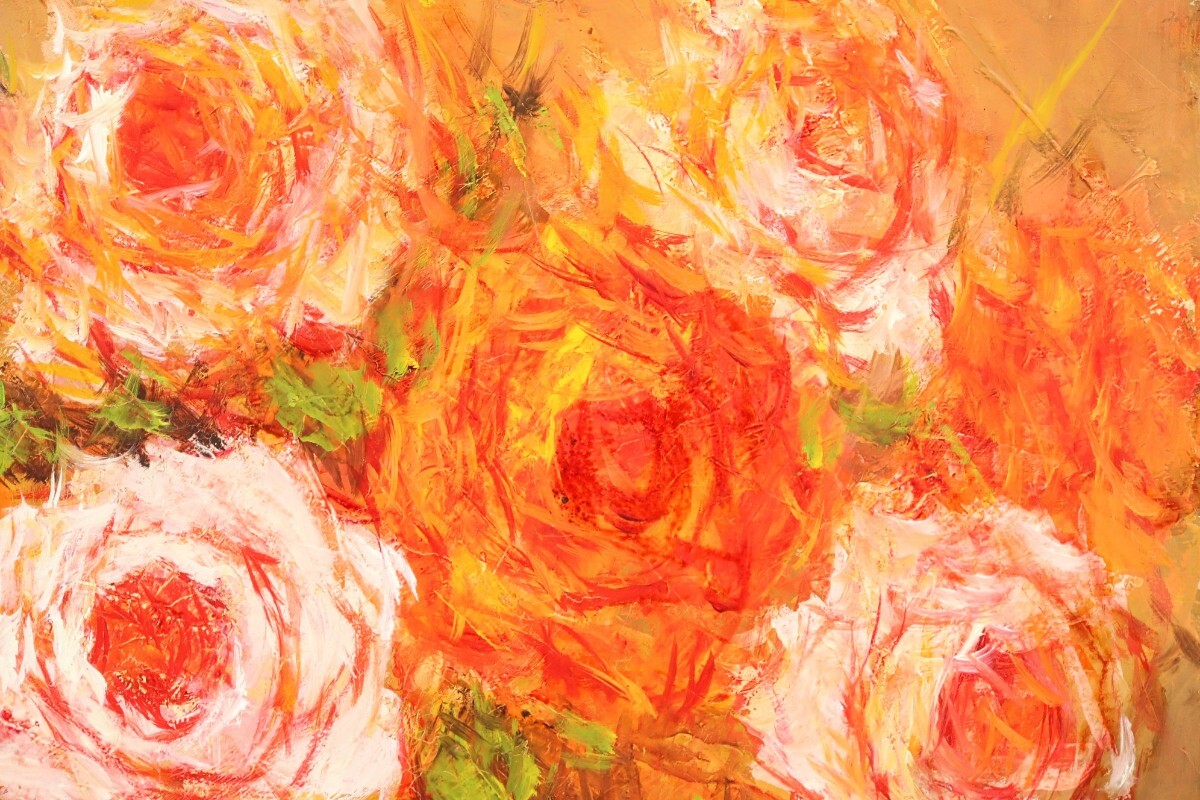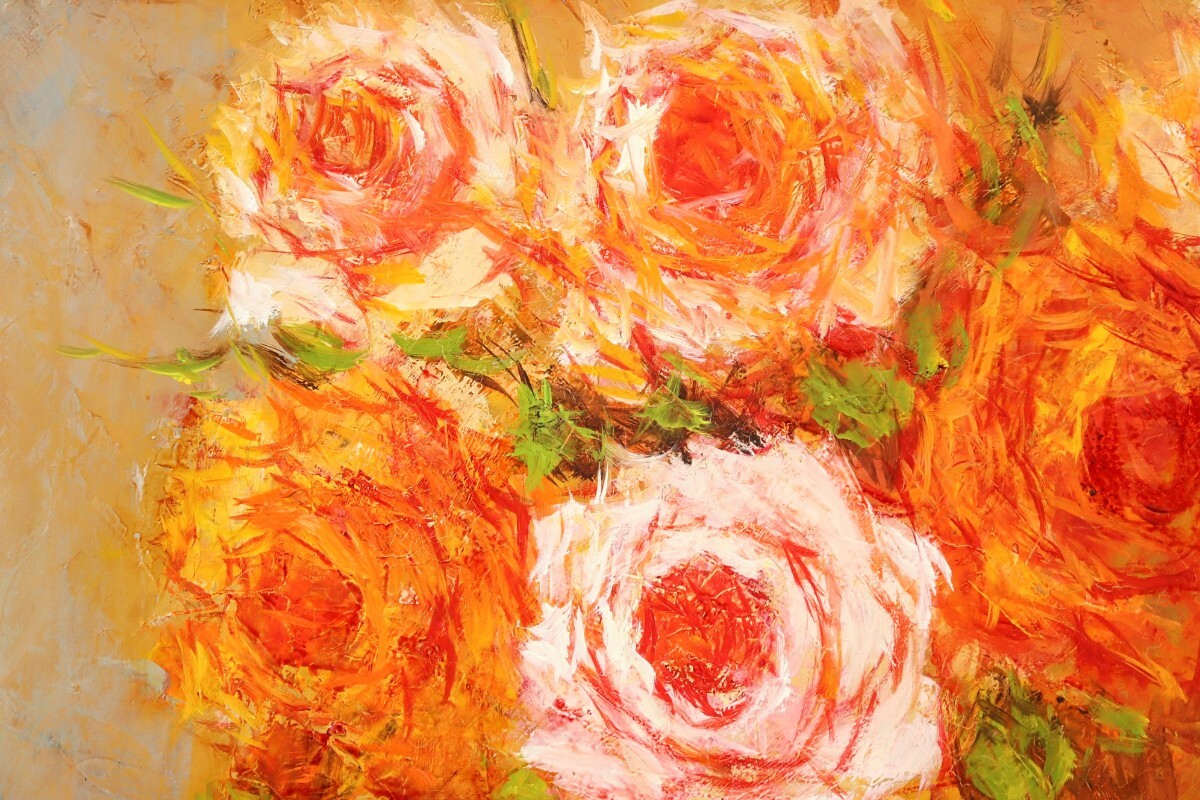 温かみのある色調で華やかに咲き誇るバラの花々を描いた