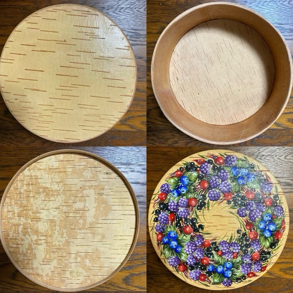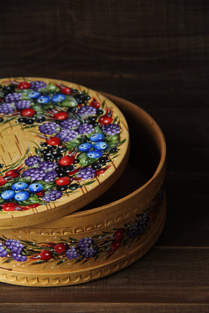 ロシアの伝統工芸品、白樺樹皮で作られたベレスタの円形の最新作の小物入れ「"Berry extravaganza"(ベリーの華やかな祭典)」です。