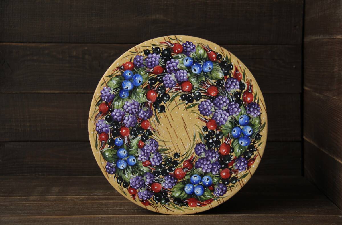 ブラックベリー、ブラックカラント、ブルーベリー、ローズヒップの華やかなベリーミックスのリースがロシア人ベレスタアーティストのガリーナさんによってテンペラで美しくハンドペイントされています♪