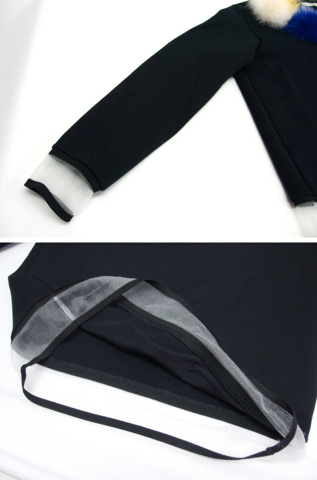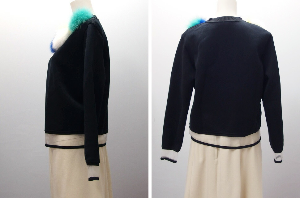 | コメント | シンプルな黒地で、襟元にはカラフルな4色のファーが付いた、お洒落なトレーナーです。袖口と裾には、スケルトンなオーガンジー素材が使われており、軽やかさを演出!カジュアルで、存在感も抜群なトップスです。 |