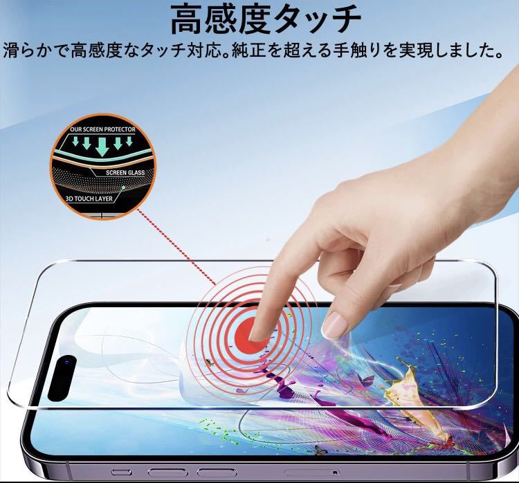 【仕様】高透過率,表面硬度9H ,2.5Dラウンドエッジ加工 指紋防止 防汚コート 飛散防止処理 自動吸着 3Dタッチ感度対応。