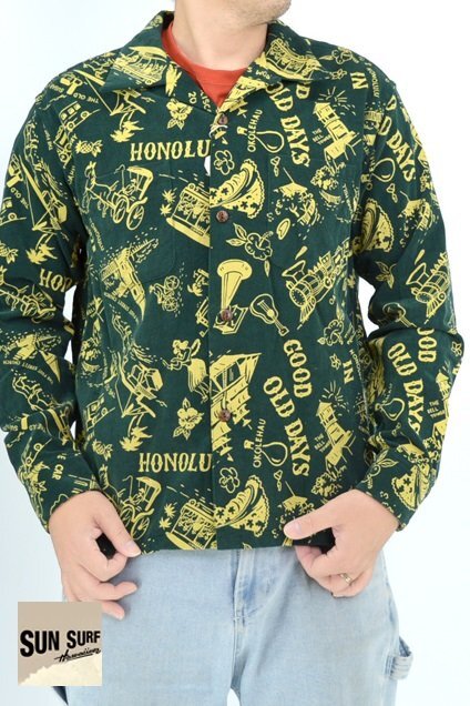 アロハシャツの黄金時代とされる1930~50年代にかけて作られた「ヴィンテージ」と呼ばれる貴重なアロハシャツを再現し、現代に蘇らせているブランド「SUN SURF」から「GOOD OLD DAYS」コーデュロイ長袖オープンシャツ(SS29338)のご紹介です。 1940年代後期に作られたオアフ・ガーメント社の作品です。 「古き良き時代」というタ イトルが付けられた本作に描かれているのは、南国の楽園として華やかな発展を遂げる前のハワイ。 馬車やオアフ鉄道などが描かれていることから1890年代後半のハワイの情景であることが推測できます。 当時を象徴するモチーフを使い、単色の抜染で表現したノスタルジックな雰囲気に心奪われる一枚です。 ボディーには、しっかりとした肉厚なコーデュロイ生地を採用。 | ||||||||||||||||||||||||||||||