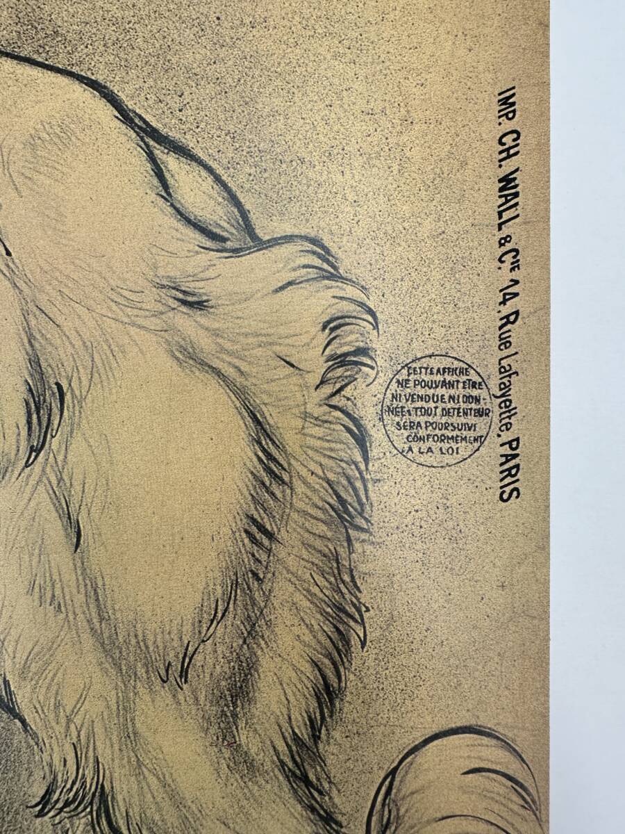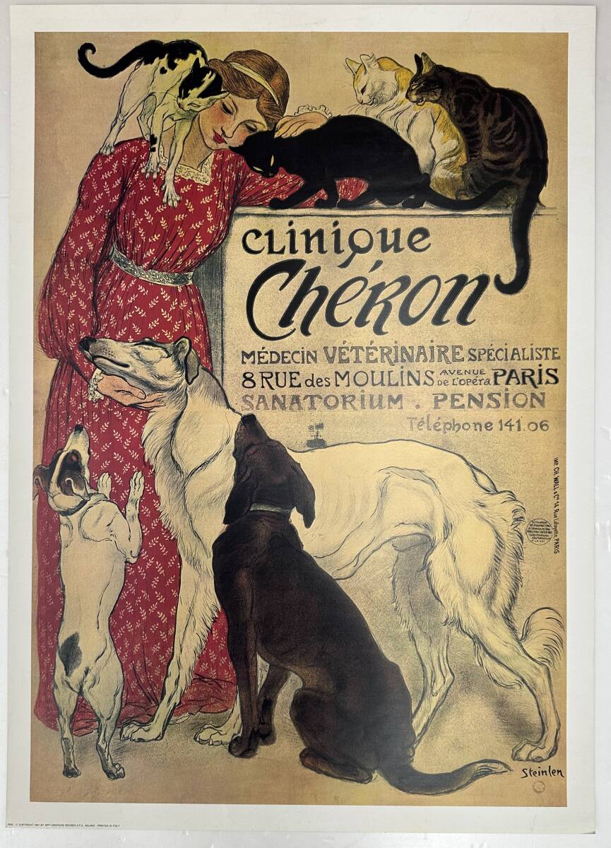 黒猫のモチーフで有名なアールヌーボーの画家スタンラン。原画のシェロン動物病院は1905年頃の作品ですが オフセット印刷のこちらのポスターは1991年にイタリアで刷られたものです。右下の角折れ以外は状態も良いです。 アールヌーボーのレトロで華やかな世界感がお好きな方にオススメの一品です。