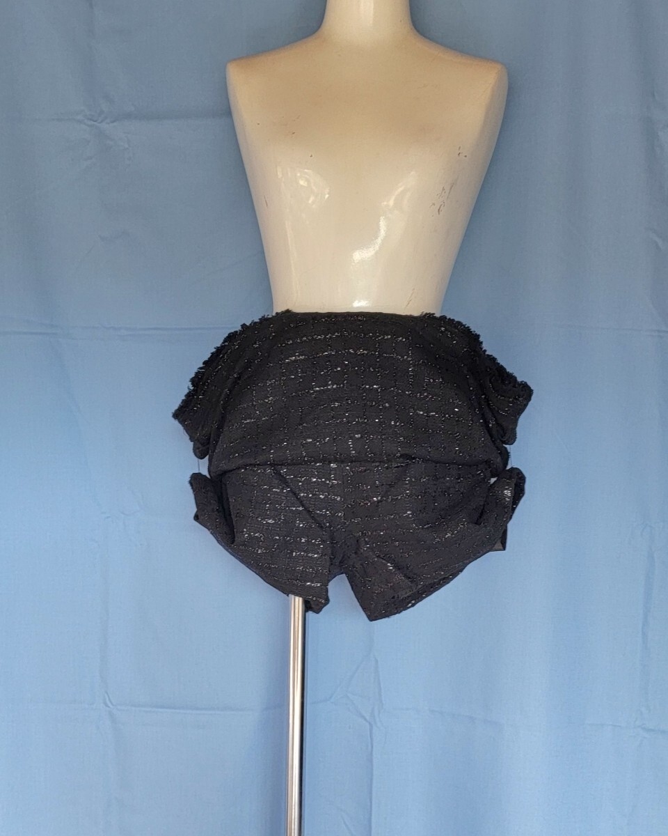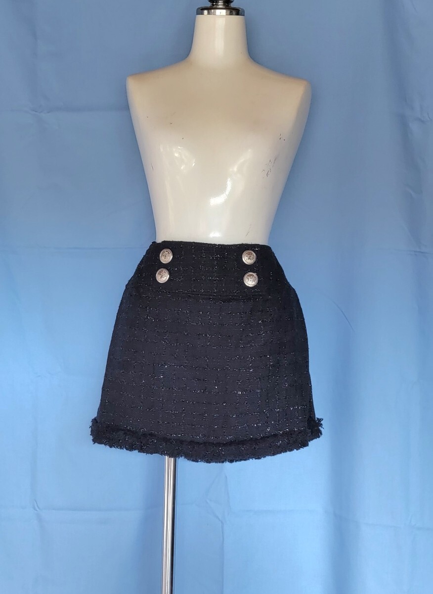 キュロット/前側飾り4つボタン、脇ファスナー、キュロット丈約35cm、裏地有り