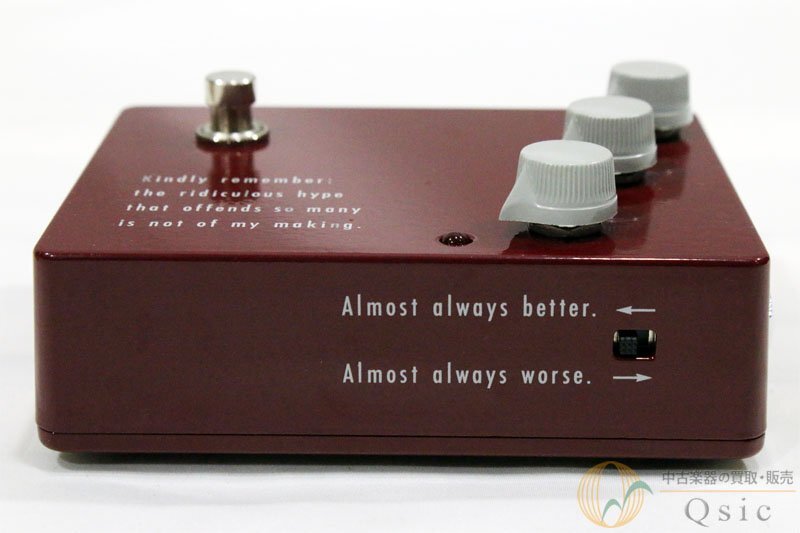 | 商品説明 | オーバードライブの王様として今も尚君臨し続けるCENTAUR(ケンタウロス)。そのサウンドをベースにした数々のクローンモデルが発売されましたが、2012年に正当の後継機種として世に放たれたKLON KTRが入荷です! オリジナルと比べ、一部コンデンサーや機能の追加はあれど、基本的な回路やサウンドはCENTAURとほぼ同じに設計。サイズは小さく収まり、使い勝手が格段に向上しております。CENTAURの特徴である太く艶がある歪みは健在で、オリジナルに勝るとも劣らないゴージャスなドライブサウンドが得られます。もちろんオリジナルと同様にブースターとしても優秀で、迫力あるリードサウンドも奏でることが可能です。そしてKTR の最大の特徴として、バッファードバイパスとトゥルーバイパスの切り替え機能が挙げられます。サイドに設置されたスイッチにより切り替えることができ、CENTAUR特有の高品質なバッファーを使うもよし、原音を損ねないためにトゥルーバイパスを使うもよしと、用途に合わせてお使いいただける1台となっております。 今回の商品は正規代理店がイケベ楽器になってからの個体になります。伝説のサウンドはそのままで使い勝手が格段に向上!ぜひこの機会にお求めください! 【状態】 細かな小傷やパーツのくすみは点在しておりますが、大きなダメージはない状態です。 動作も問題ございませんので、軽い使用感は気にされない方には大変お買い得なお品となっております。 正規輸入品 |