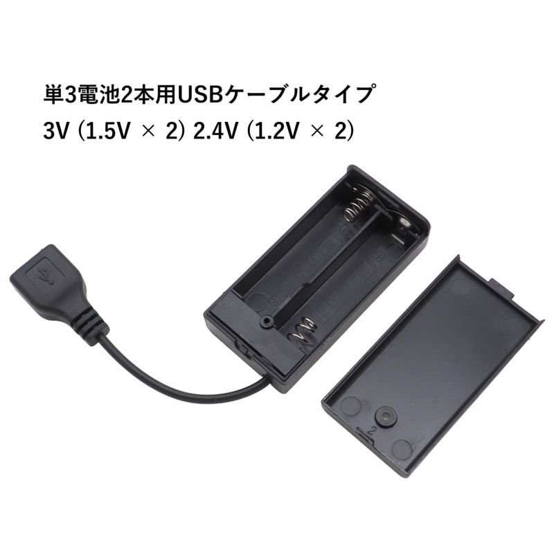 単3電池2本用USBケーブルタイプ 3V (1.5V × 2) 2.4V (1.2V × 2)USB出力:USB A(メス)ON/OFFスイッチ付き