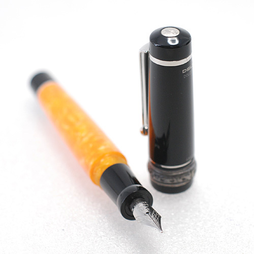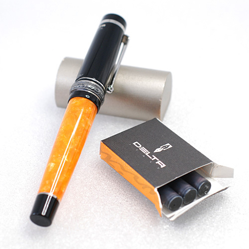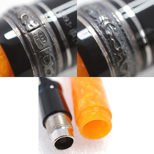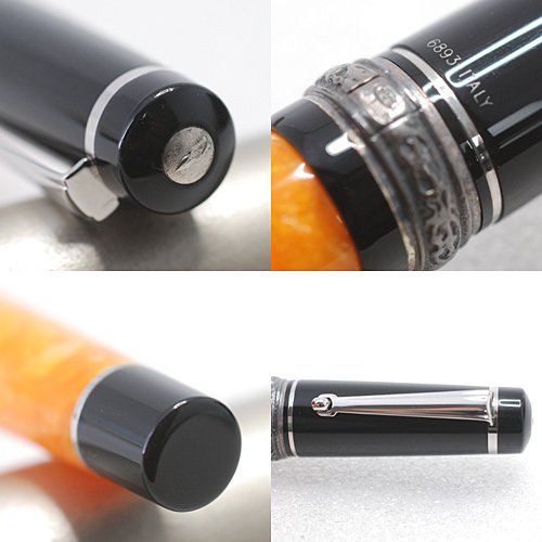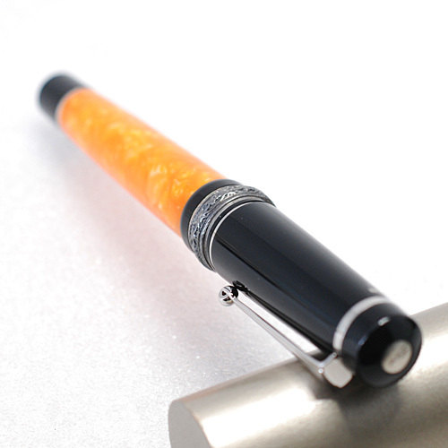 太陽をたっぷり浴びた「南イタリアのオレンジ」をイメージした、深く煌びやかな目を惹くボディ。 職人の手彫りによる、装飾されたシルバー925のキャップリング。 クリップ先のローラーは、胸ポケットに挿す時の為に、生地を傷めない様、配慮された仕様となっております。 ペン先字幅は「M字」。 試し書きは、原稿用紙で行っておりますのでご参考ください。 |