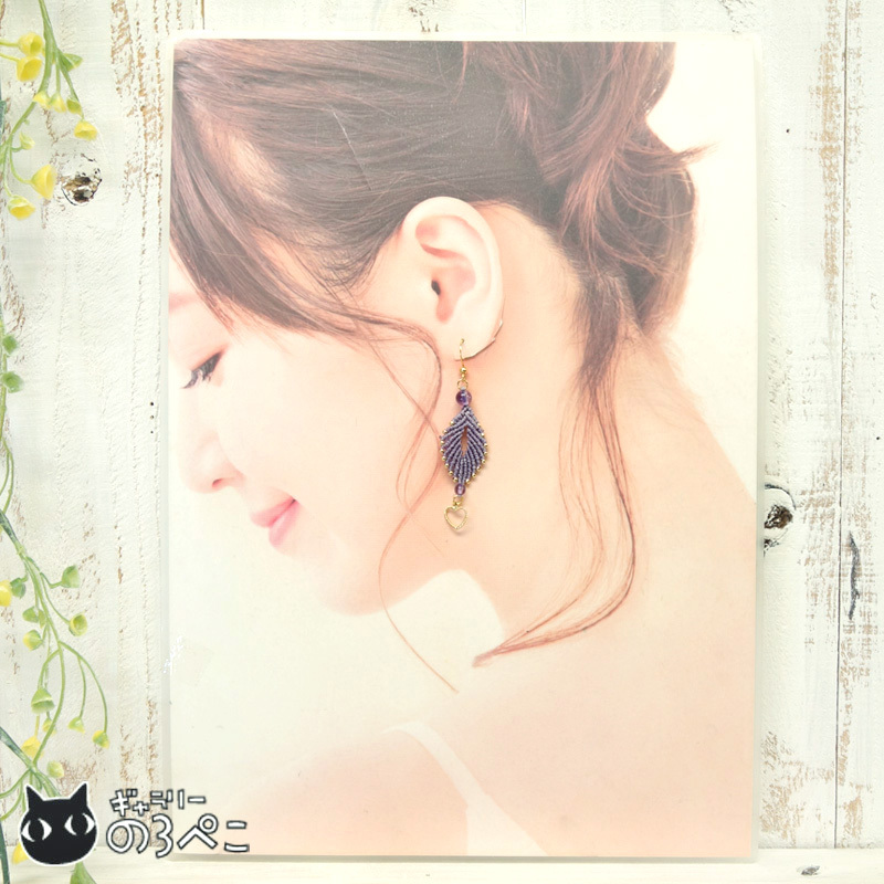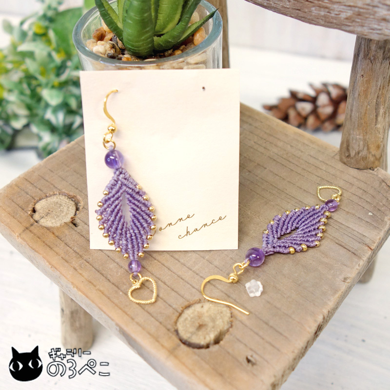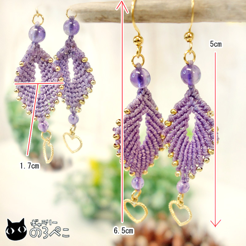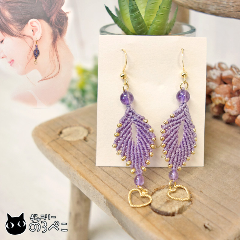天然石とマクラメ編みリーフのピアス(ラベンダーアメジストとハート・サージカルステンレスピアス) bc856-118