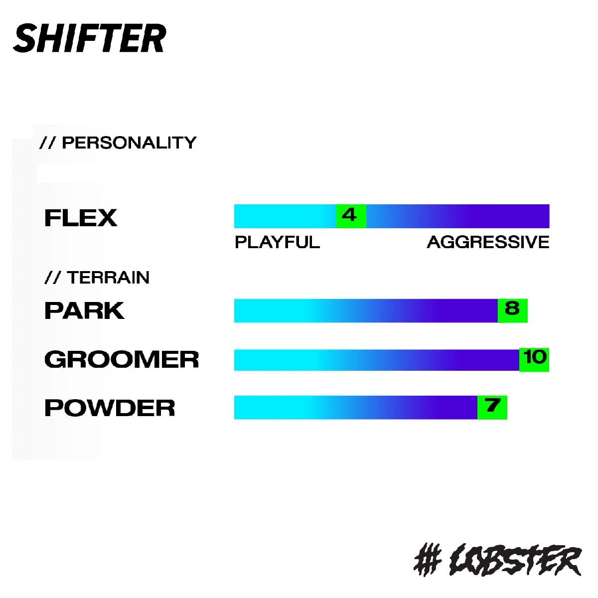 「Shifter」は、パークライディング・ジビング用にデザインされたソフトフレックスツインボードです。厄介なキンクに挑むノーリー・バックサイド・テイルから、ボックスでの最初のボードスライドまでお任せの完璧なスノーボードです。