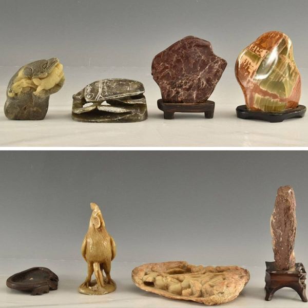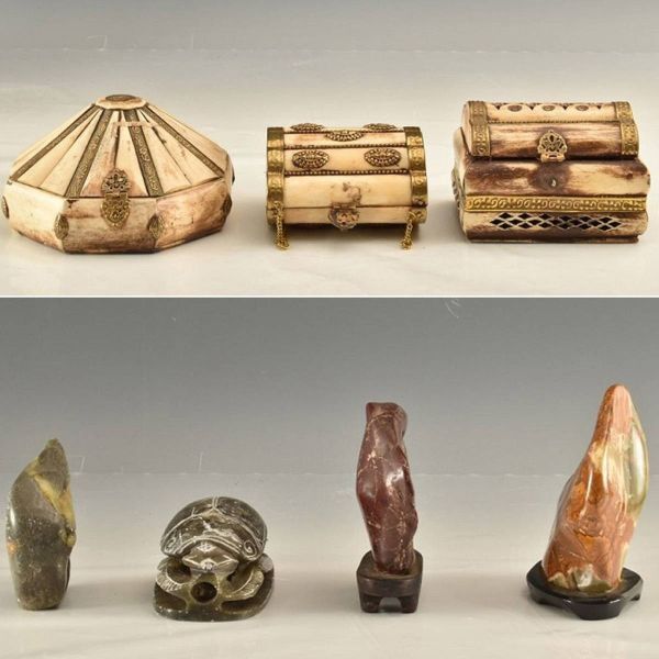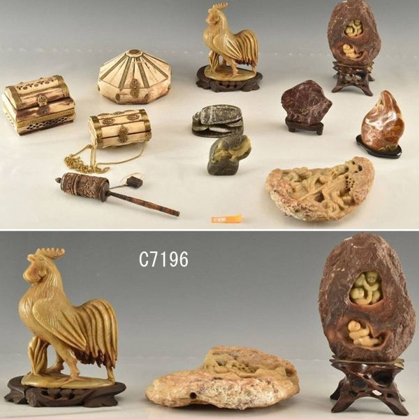 状態:全体に擦れ、所々に小チップある物あり。蓋物(大)は畳付にチップあり。ガラガラは外れている部分あり。鶏置物は台とサイズが多少あっていません。他詳細は画像をご参照ください。サイズは鶏置物をご参照ください。箱無し。【台】高さ:1.8~1.9センチ 縦:8.9センチ 横:13.6センチ。