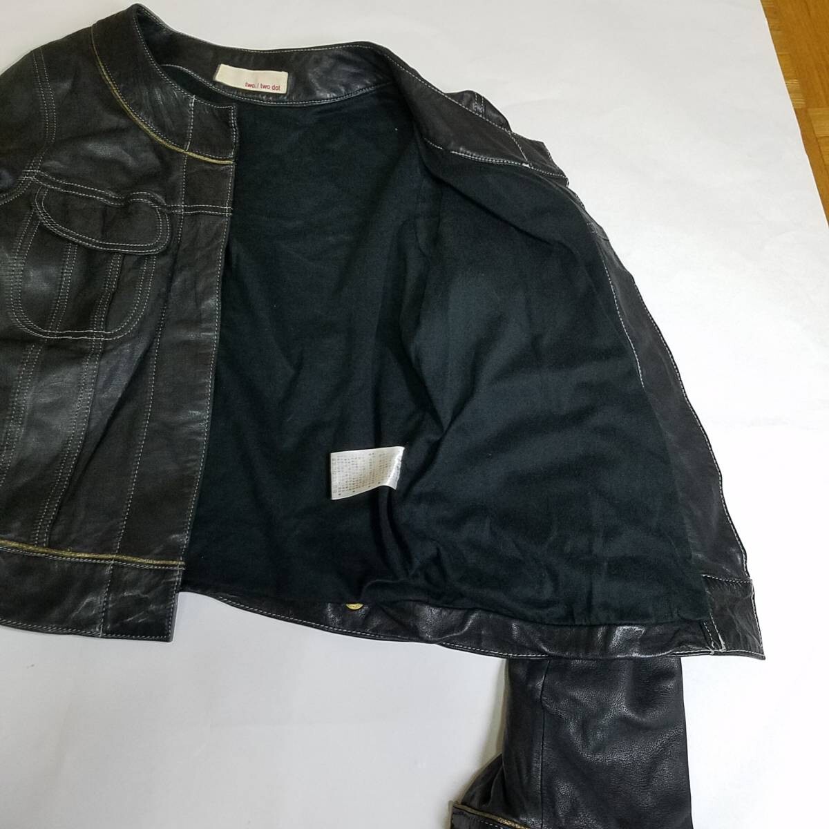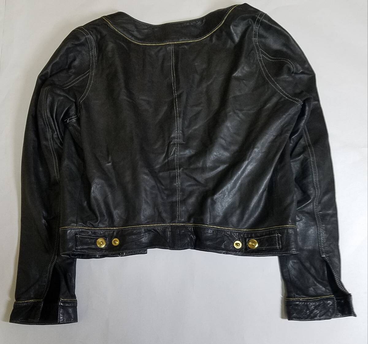 袖に対してトップスが短く、フロントがオープンでチャックやボタンはありません。光沢ある羊革で高級感があり、カッコ良く、ライダースジャケットとしても映えるとても魅力あるお品です。