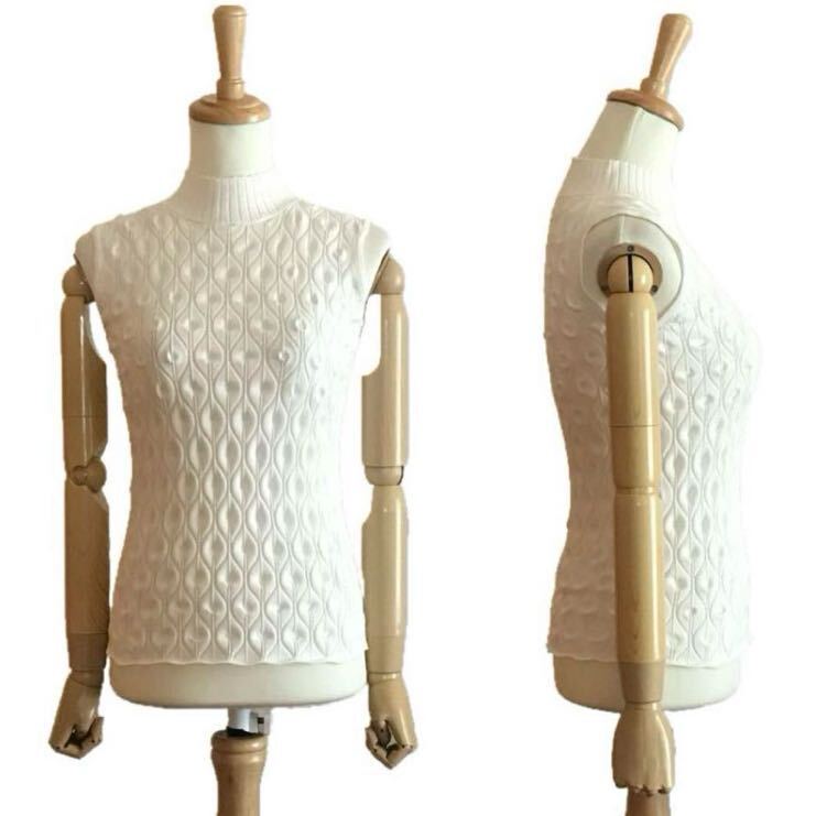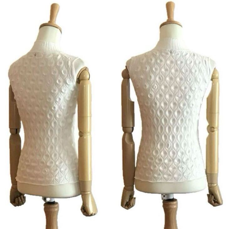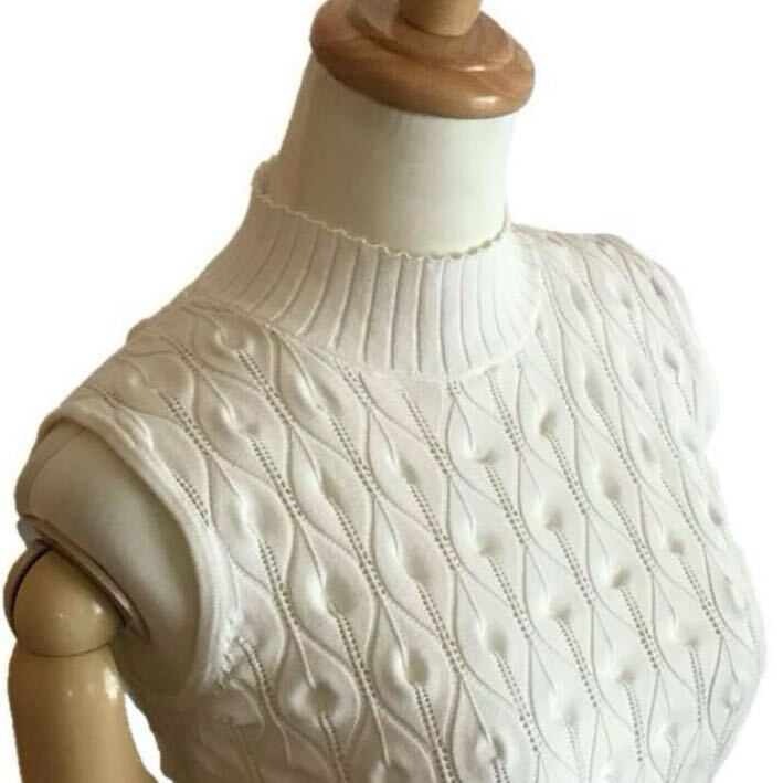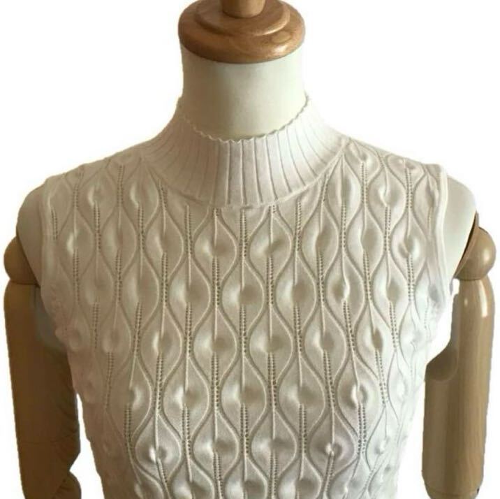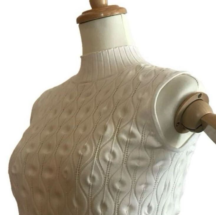 ふっくら立体感のある編みで仕上げたコットン素材のノースリーブニット。独特な表面感が、レースのような雰囲気を醸し出し、涼しげに着ていただけます。コンパクトなシルエットがすっきりとした印象で、ボリュームのあるボトムとのコーディネートでメリハリのあるスタイリングが楽しめるトップスです
