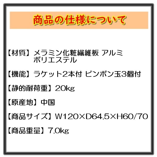 ![]() ピンポンテーブル PPT-555 ◇◆商品の仕様について◆◇ 【材質】メラミン化粧繊維板 アルミ ポリエステル 【機能】ラケット2本付 ピンポン玉3個付 【静的耐荷重】20kg 【原産地】中国 【商品サイズ】幅120×奥行き64.5×高さ60/70(cm) 【商品重量】7.0kg ◇◆発送について◆◇