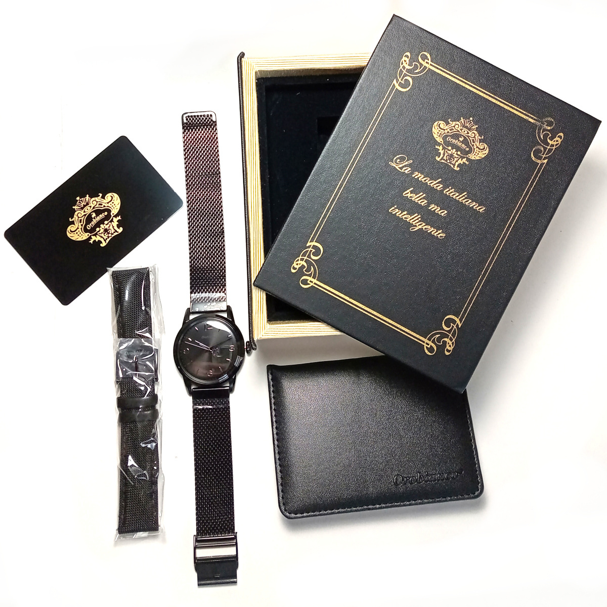腕時計、替えベルト、パスケースのセットです。 【モデル】ERUDITO エルディート 【品番】OR0073-AB1 【カラー】ブラック 【ムーブメント】自動巻き 【素材】ステンレススチール ケース:ドームガラス 【防水】3気圧防水 【サイズ(約)】ケース:3.8㎝×3.8㎝、厚み1.1㎝ ベルト:幅2㎝ 【付属品】専用ケース(書籍デザイン) 替えベルト(メッシュベルト未開封) ギャランティカードと取扱説明書の入ったケース (4枚収納可能のカードケース) ※画像5枚目全てが出品商品です。 モデル違い、デザイン違い等他にも多数出品しています。 発送方法について ゆうパック元払い発送以外は承っておりません。 同梱いたします。(何点でも送料は1点分です。) 土日祝日の発送はお休みを頂いております。 | |