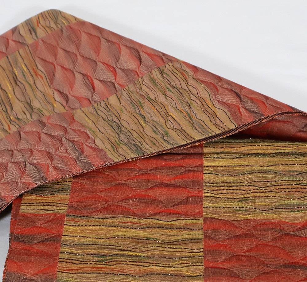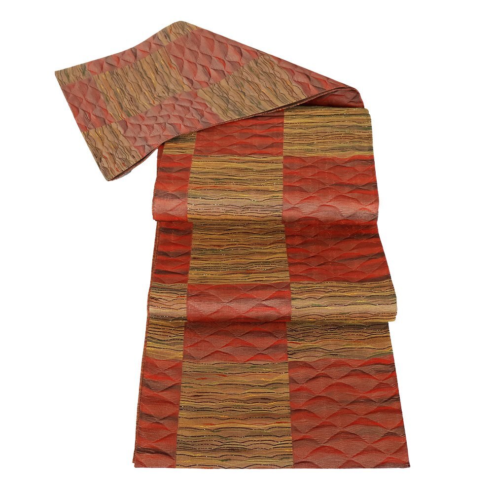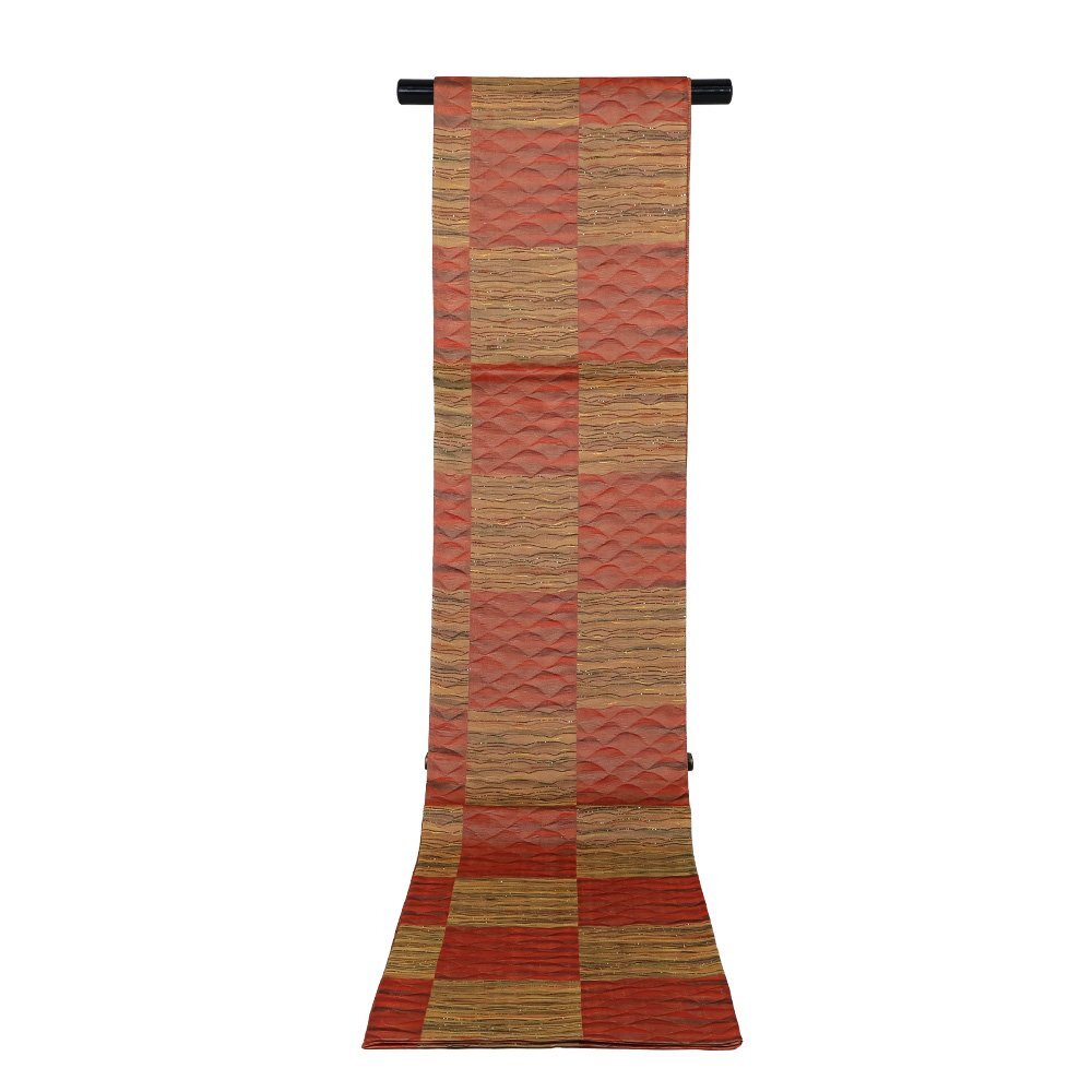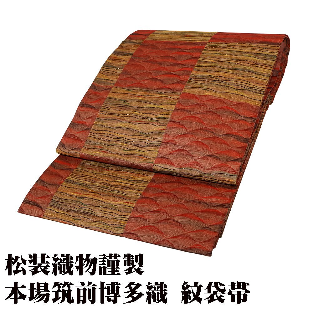 | 松装織物 本場筑前博多織 紋袋帯 赤・緑・黄土色地 すくい織・波・市松模様 新品 仕立て上がり |