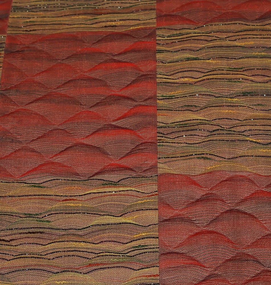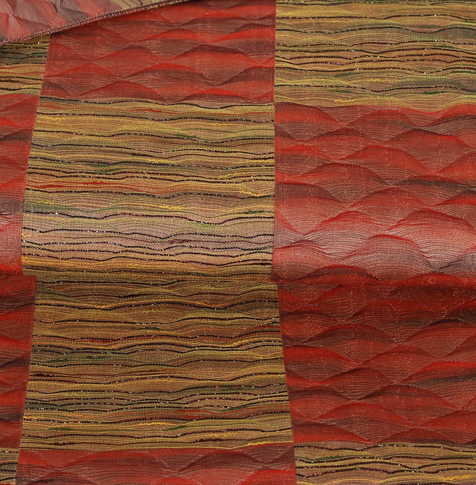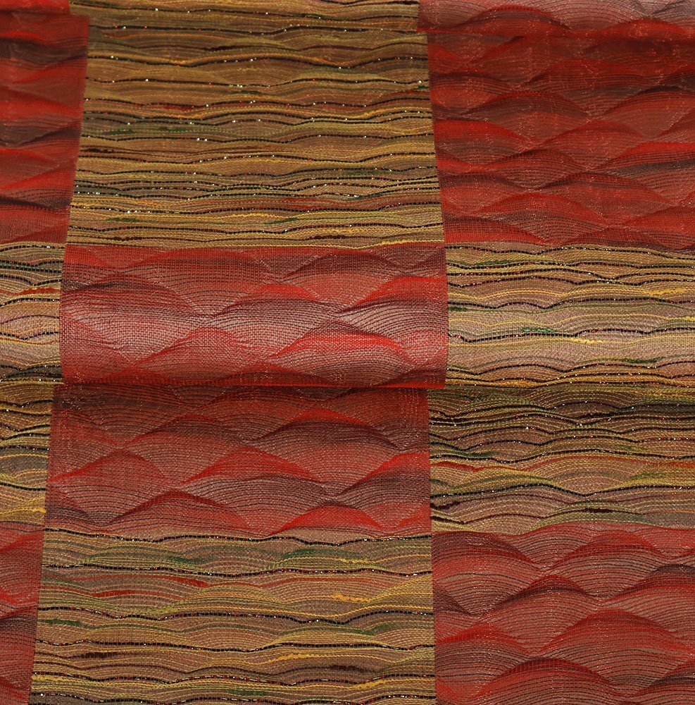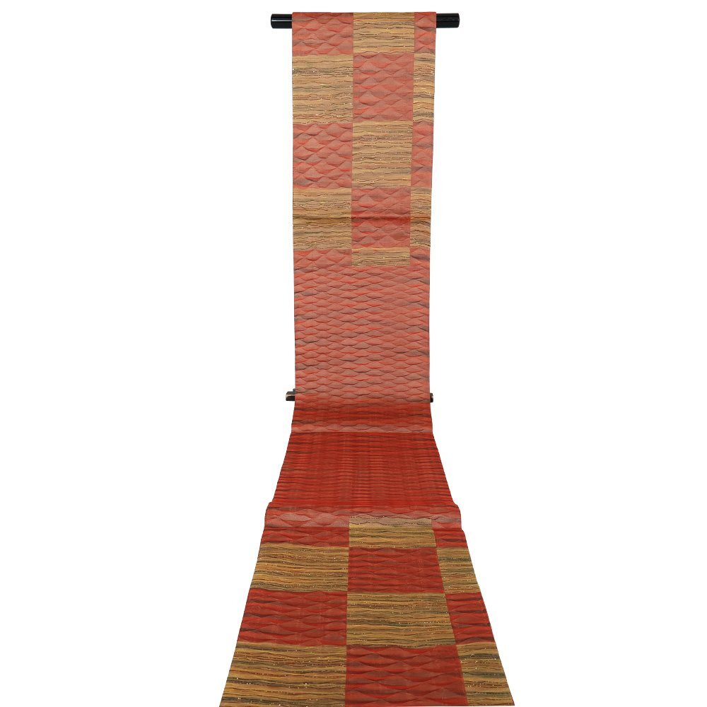 松装織物 本場筑前博多織 紋袋帯 赤・緑・黄土色地 すくい織・波・市松模様 (写真では上手く色が出ない場合があります。ご了承下さい) ※お使いのディスプレイの種類や設定の差により 実物の色と画像の色が少々異なることもございます。 写真の枚数が多いので一度パソコンでご覧ください。 |