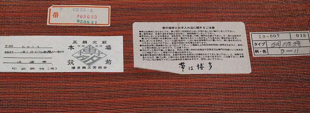 松装織物の反端付き。 本場筑前博多織の認証ついています。 付下げ・訪問着用にいかがですか。 新品。六通。 芯入仕立て上がり品。 すっきりとした配色で現代の空間に映えるもの。 日本の古典文様をはじめ、長い歴史で培った高い技術に 今様の美しい意匠が光ります。 とても上品な帯です。 仕立て上がり。 上品な仕上がりになっています。 生地の状態は良いと思います。 目立ったシミ汚れはないと思います。 美品です。 |