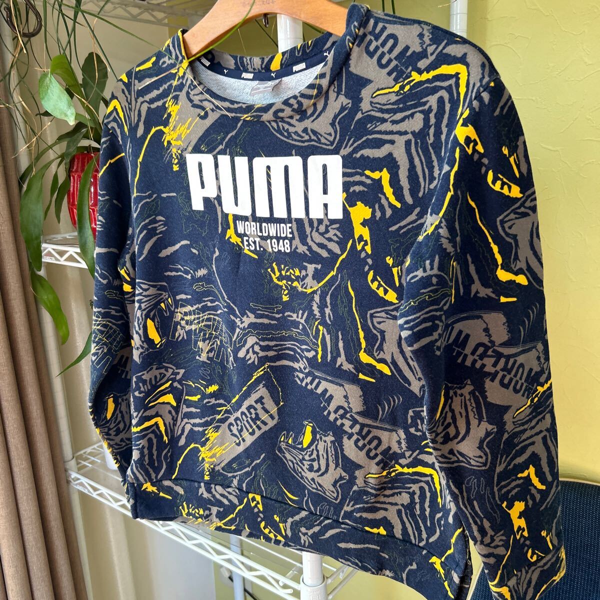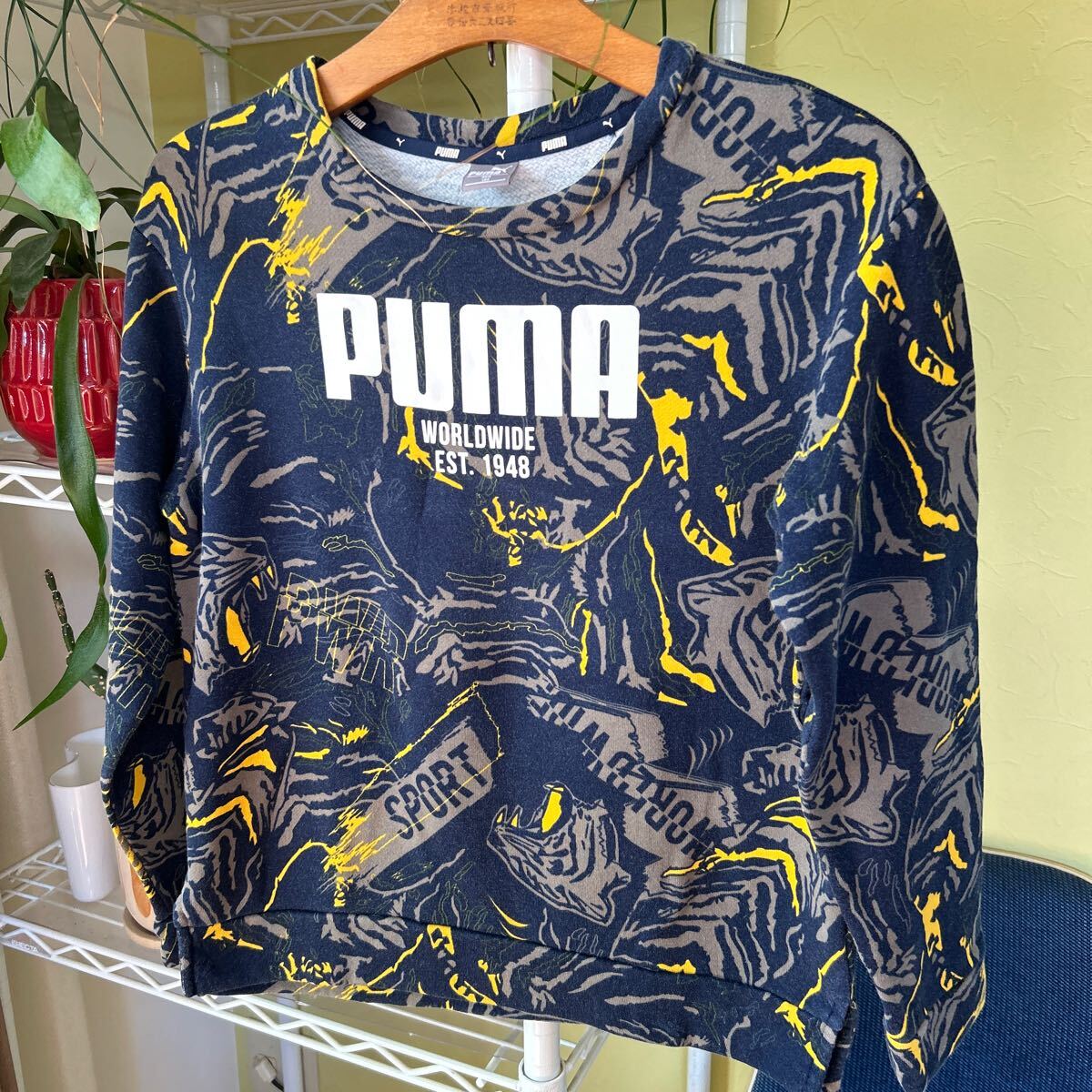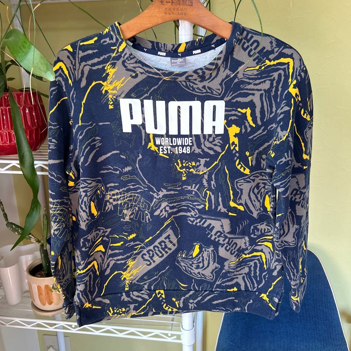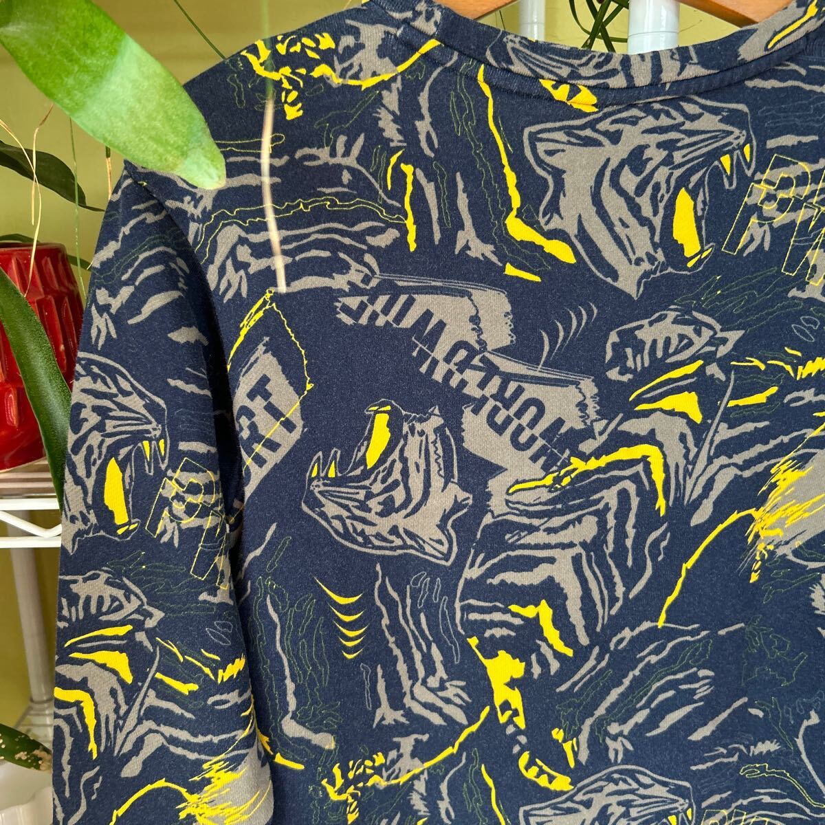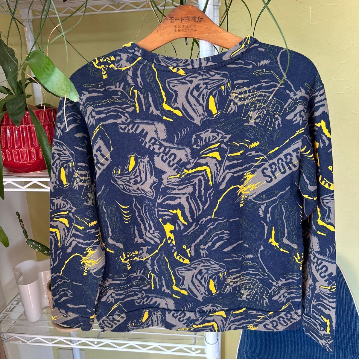 袖丈50(脇下縫目〜袖先端)。多少の誤差はお許しください。良い雰囲気です。綿100 スウェット 総柄 できる限りダメージは説明させていただきますが、こちらが気づかない程度のわずかなしみ、よごれ、