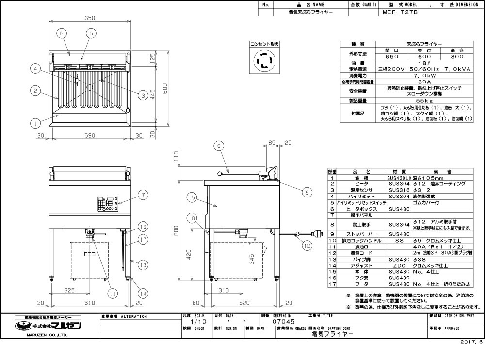 付属品:フタ、天ぷら用仕切板、スクイ網、油缶(大)、油コシ網、油切板、油切網、天ぷら用スベリ板