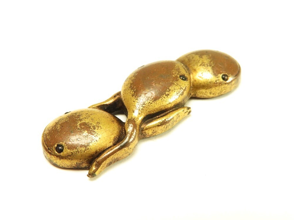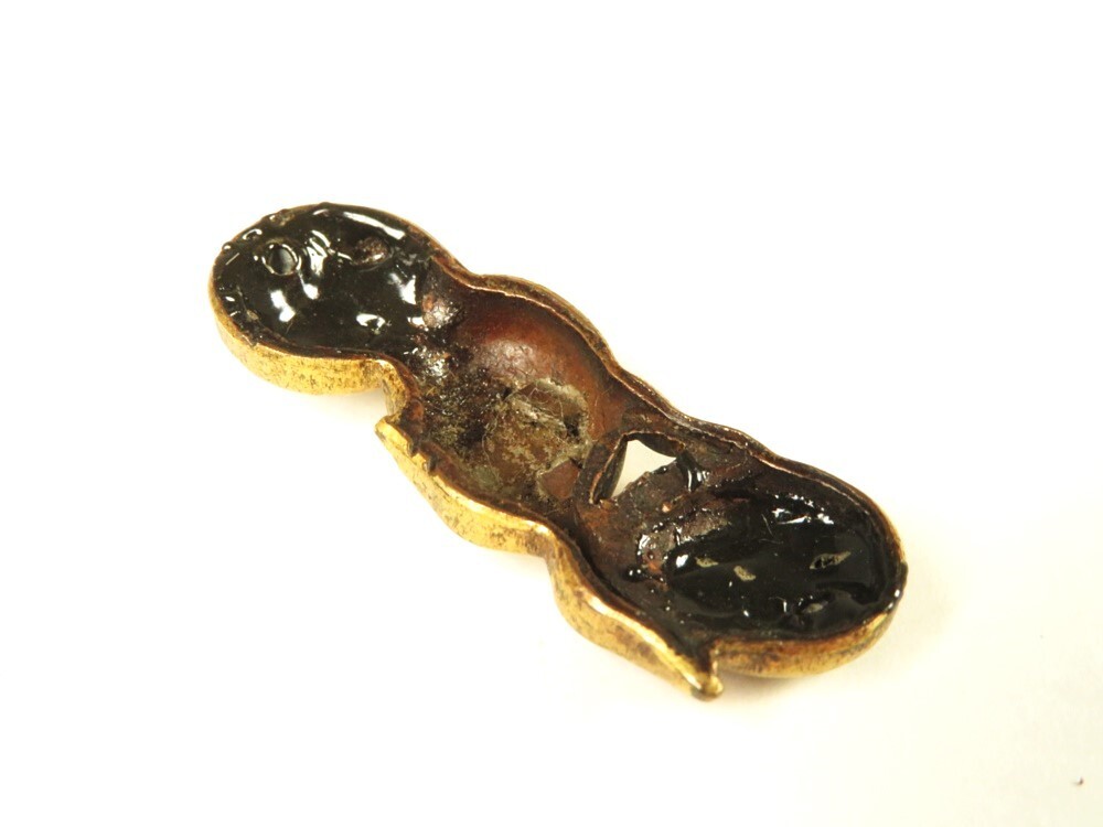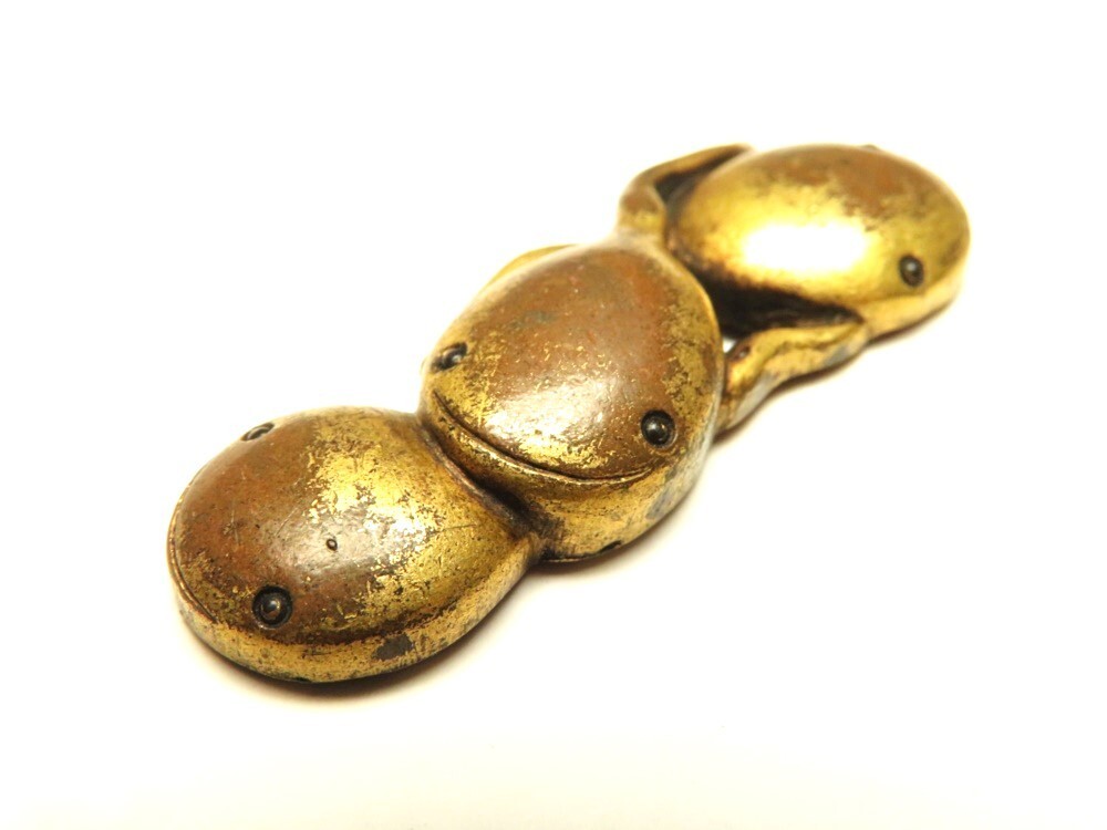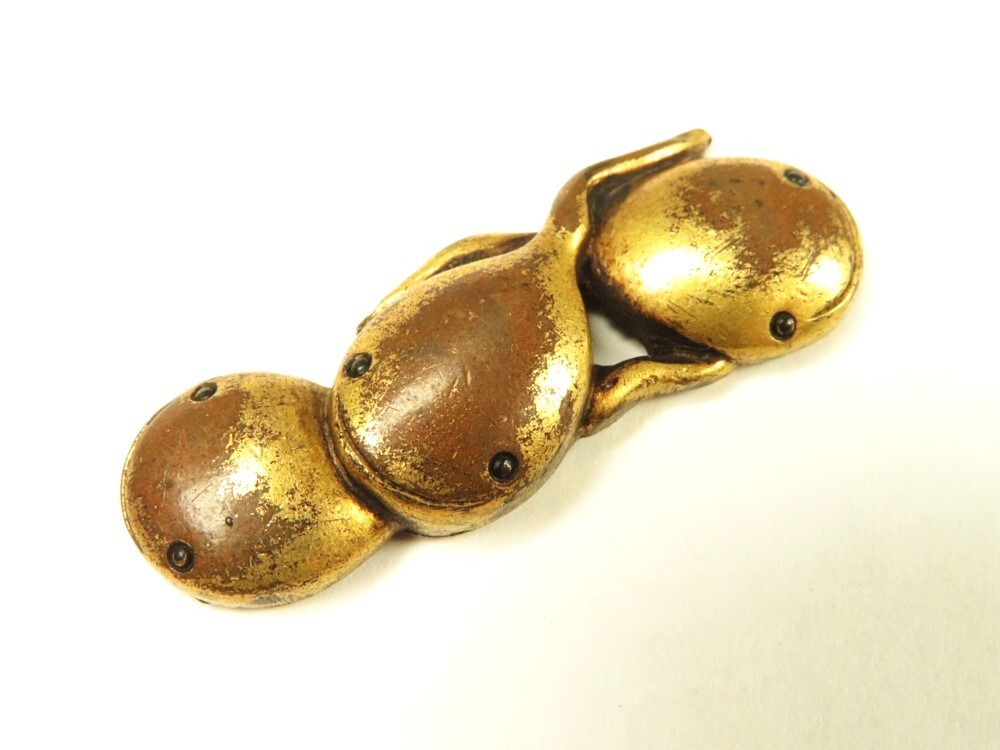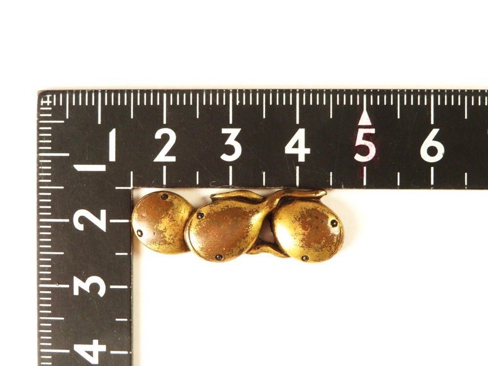 ●明治期 堤物 タバコ道具 銅 鍍金 おたまじゃくし 金具 重量4gになります。古い物ですが極力状態の良い作品を出品しておりますので是非ご覧ください。 【状態】 ●経年を考慮し状態はよいと思います。 【サイズ(約)】 ●3.2×1.1㎝ (素人寸法ですので、若干の誤差はお許し下さい) 【重量(約)】 ●4g 【領収書に関しまして】 領収書発行は致しておりません。 Yahoo!かんたん決済手続き完了時の確認画面をプリントアウトして領収書としてお使い下さい。 ※領収証として税務署に認められております。 ご了承のうえでのご参加をお願いいたします。 |