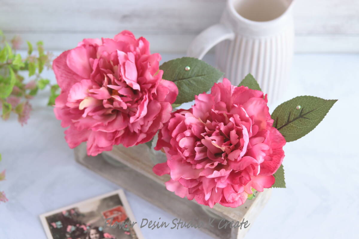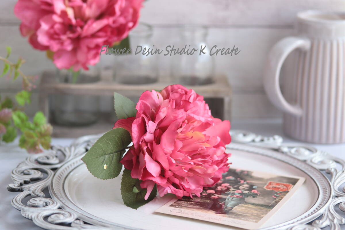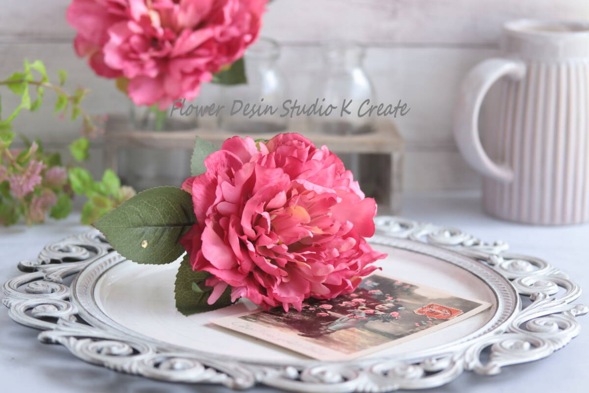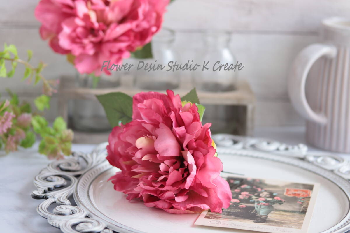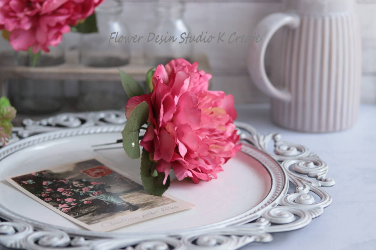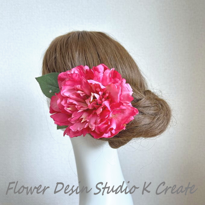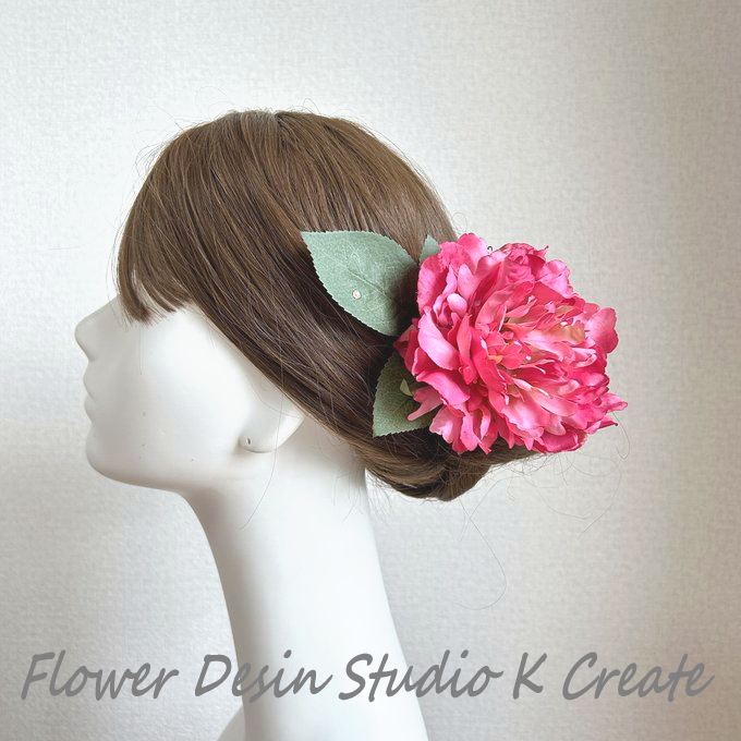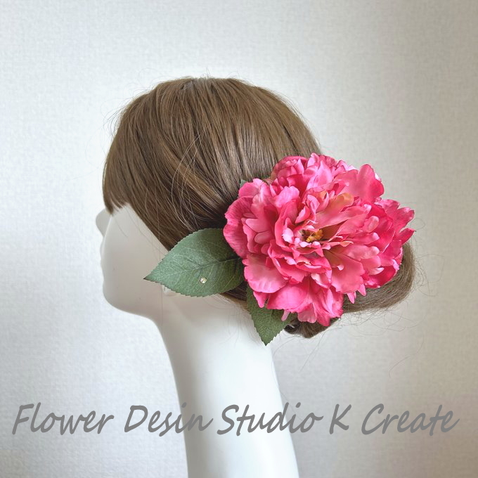 | ローズピンクのピオニーとグリンリーフのヘッドドレス ローズピンク 芍薬 髪飾り 浴衣髪飾り フローレス フラメン花飾り | |||