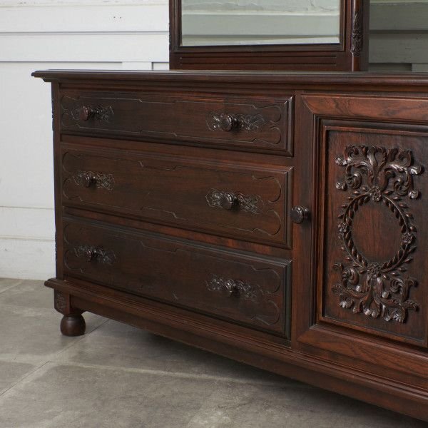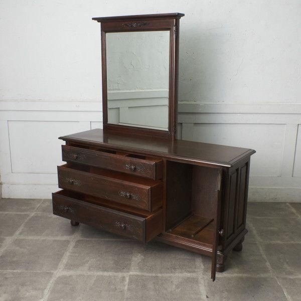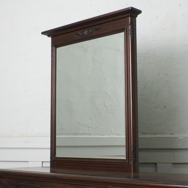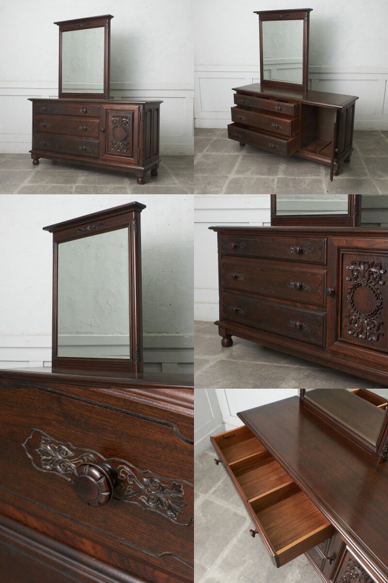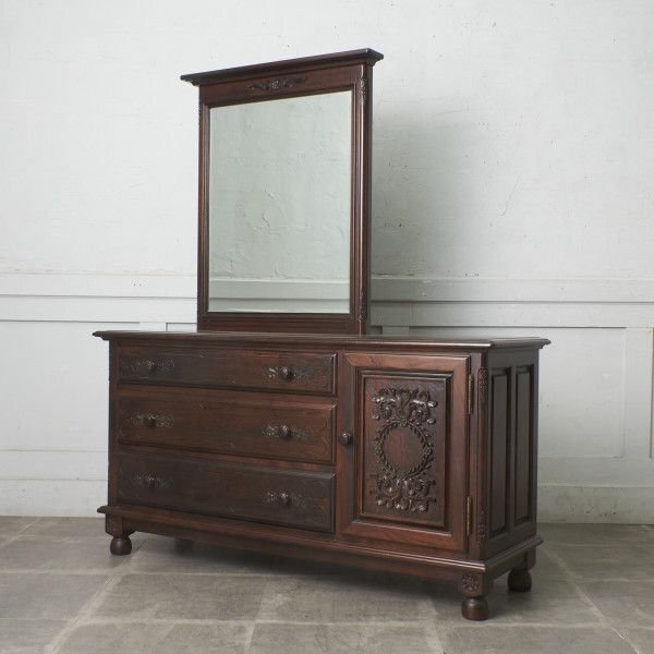 上質なオーク材を使用した、落ち着いた雰囲気が漂うドレッサー。手仕事の木彫によって生み出された立体的なモチーフが美しく、繊細さと重厚感を兼ね備えたディテールが目を惹く上質なお品です。
