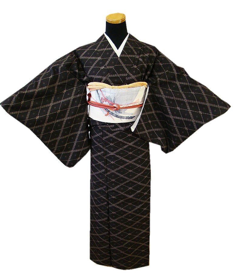| 商品説明 | こちらのお品は「袷」でございますので、10月~5月までお召頂ければと思います。 大変しなやかで裾さばきが良く、シャリやハリのあるさらりとした着心地良い紬地、 渋い黒茶色地に茶色の菱繋ぎ柄の織柄、 八掛は紺鼠色(正絹)、幅広い年代の方にお召し頂けます。 扱い易く〆易い紬地のなごや帯(たいこ柄)は、 白色地に灰青、藍鼠、橙、水色等の草木や蝶の織柄が洒落感溢れる帯姿を奏でております。 また、帯揚げは総絞り、樺色地に絞り入り、 帯〆は平組、エンジ色地に撫子色等の編み込みの組紐(中国製)となっております。 |