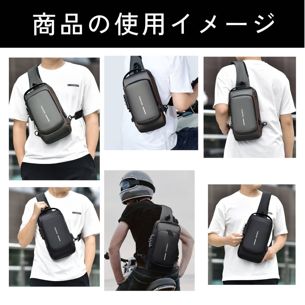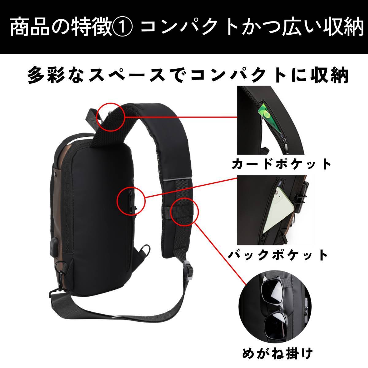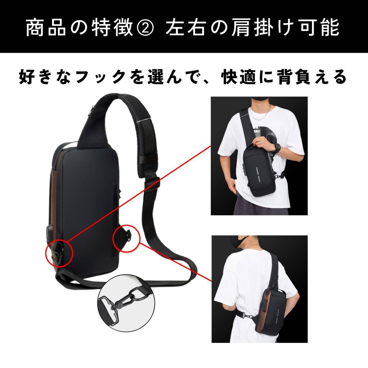 ボディバッグ ショルダー バッグ ブラック/ブラウン スポーツバッグ 斜めがけ USBポート 軽量 大容量 撥水 自転車 バイク 旅行 通学