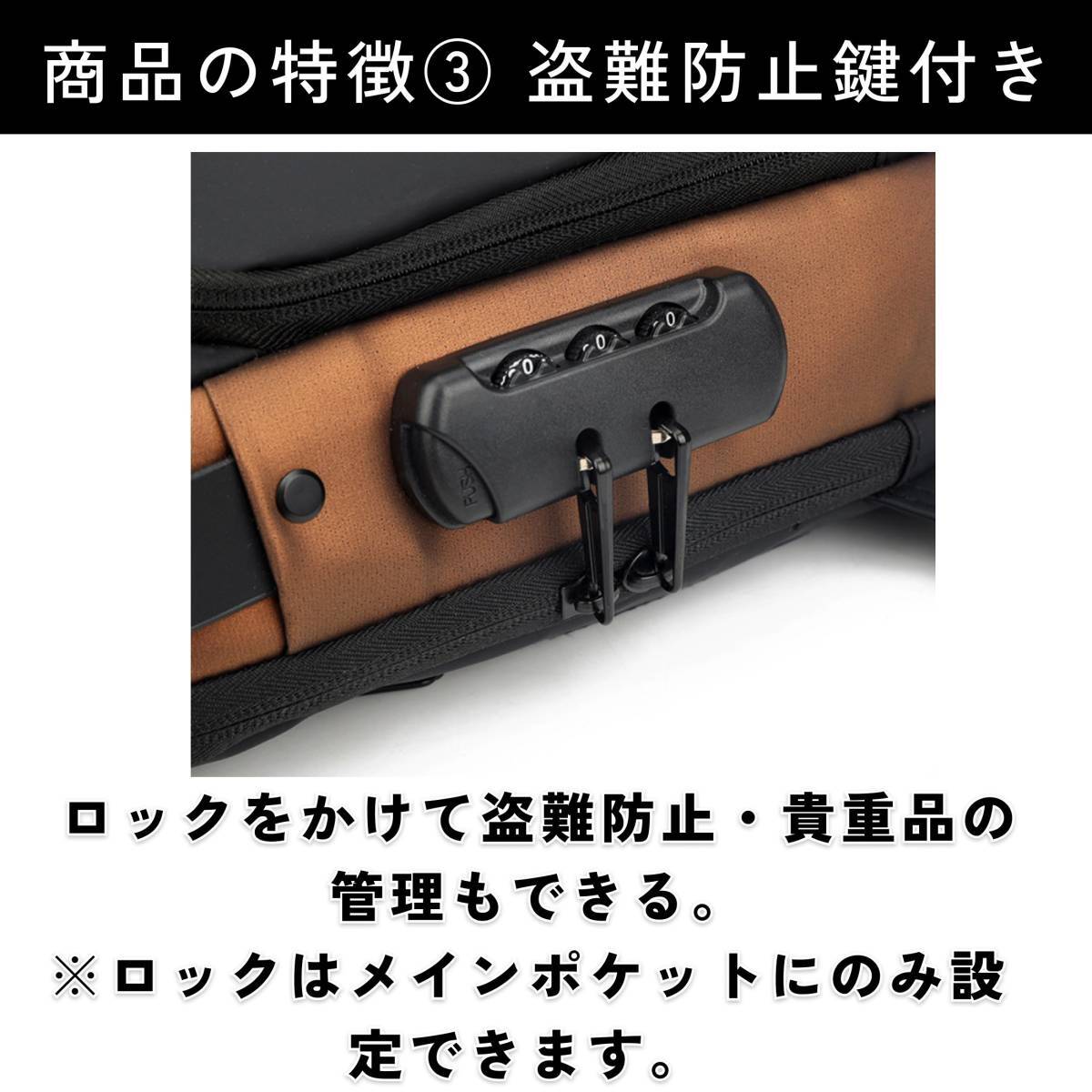 いくらスタイリッシュで使いやすいバッグでも、バッグの中身が盗難に遭うようであれば、海外旅行、ライブ会場、満員電車などでは安心して使うことはできません。その点、このバッグにはメインポケットにパスワードロックを付属しているため、財布・タブレット・スマホなどの貴重品も安心して持ち歩くことができます。