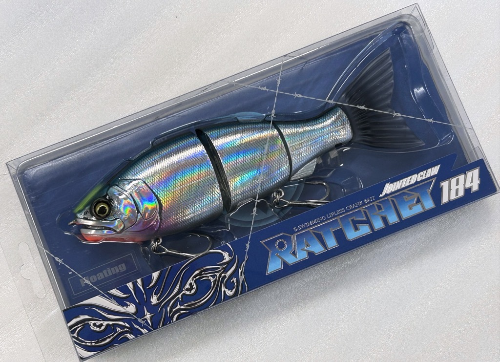 「ジョインテッドクロー ラチェット184」は、「シフト183」より継承した【ROMダンパー】と、新開発のビッグテール【ROMテール】を搭載した強波動のS字形ビッグベイトです。スローなS字スイミングやデジ巻きアクションはもちろん、超高速リトリーブやハードジャークではボディを激しく揺さぶるハイアピールな「S字リッピングアクション」を得意とした次世代のジョインテッドクローです。