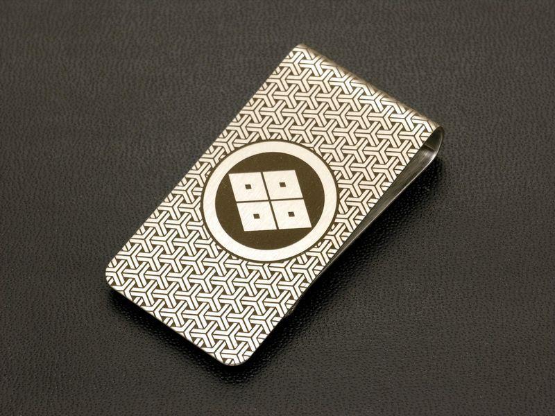 丸に四つ目菱 家紋入り マネークリップ まるによつめびし money clip 戦国武将 家紋グッズ 送料無料 丸に四ツ目菱【オーダーメイド可】