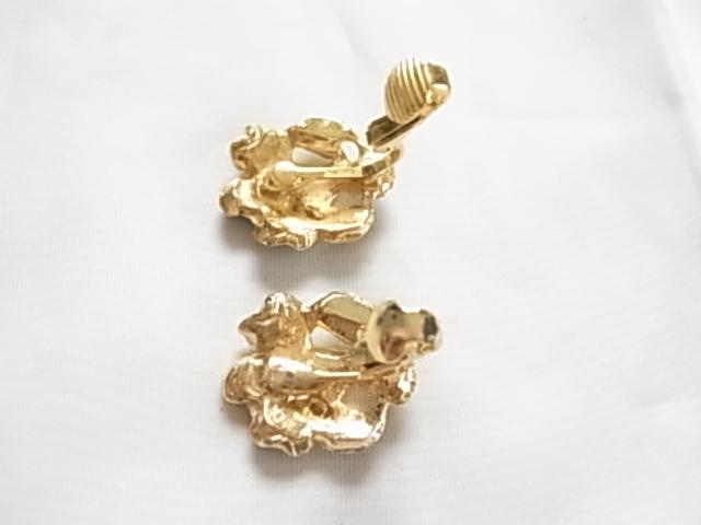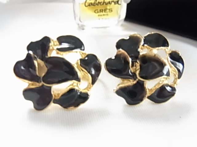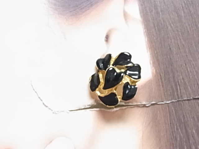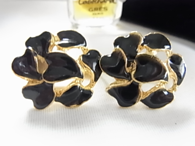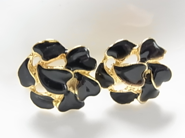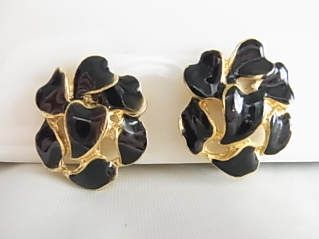 ビンテージ/ヴィンテージ 黒色 ブラックトーン 長細いハートが連なったような流れるようなデザイン エナメル装飾のレトロイヤリング◆