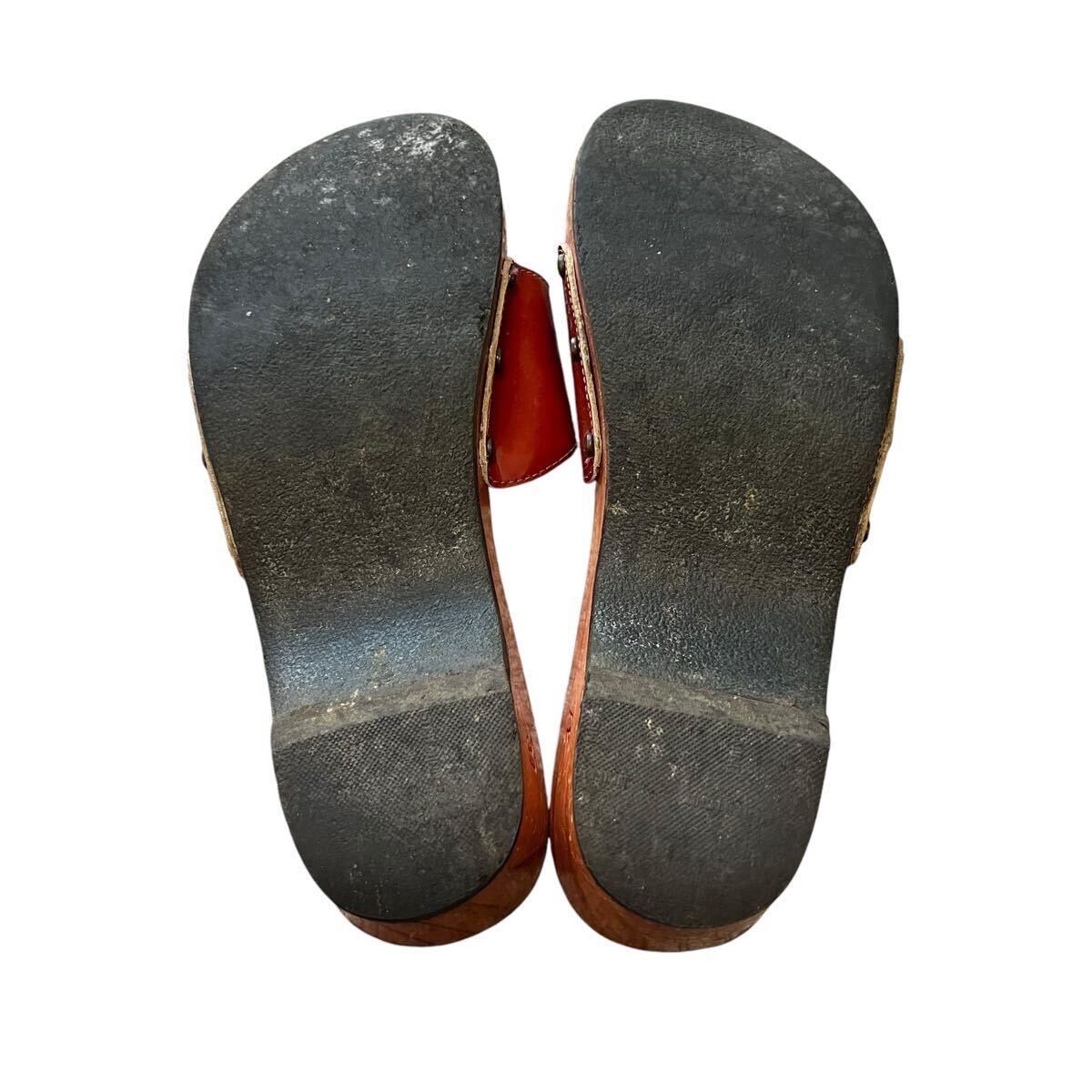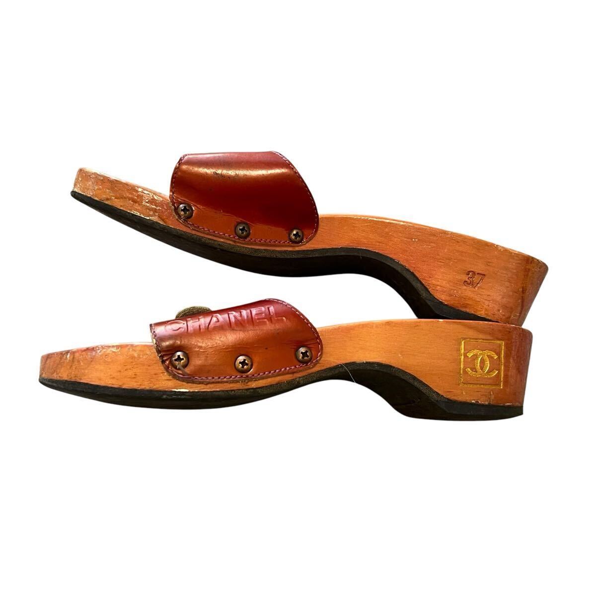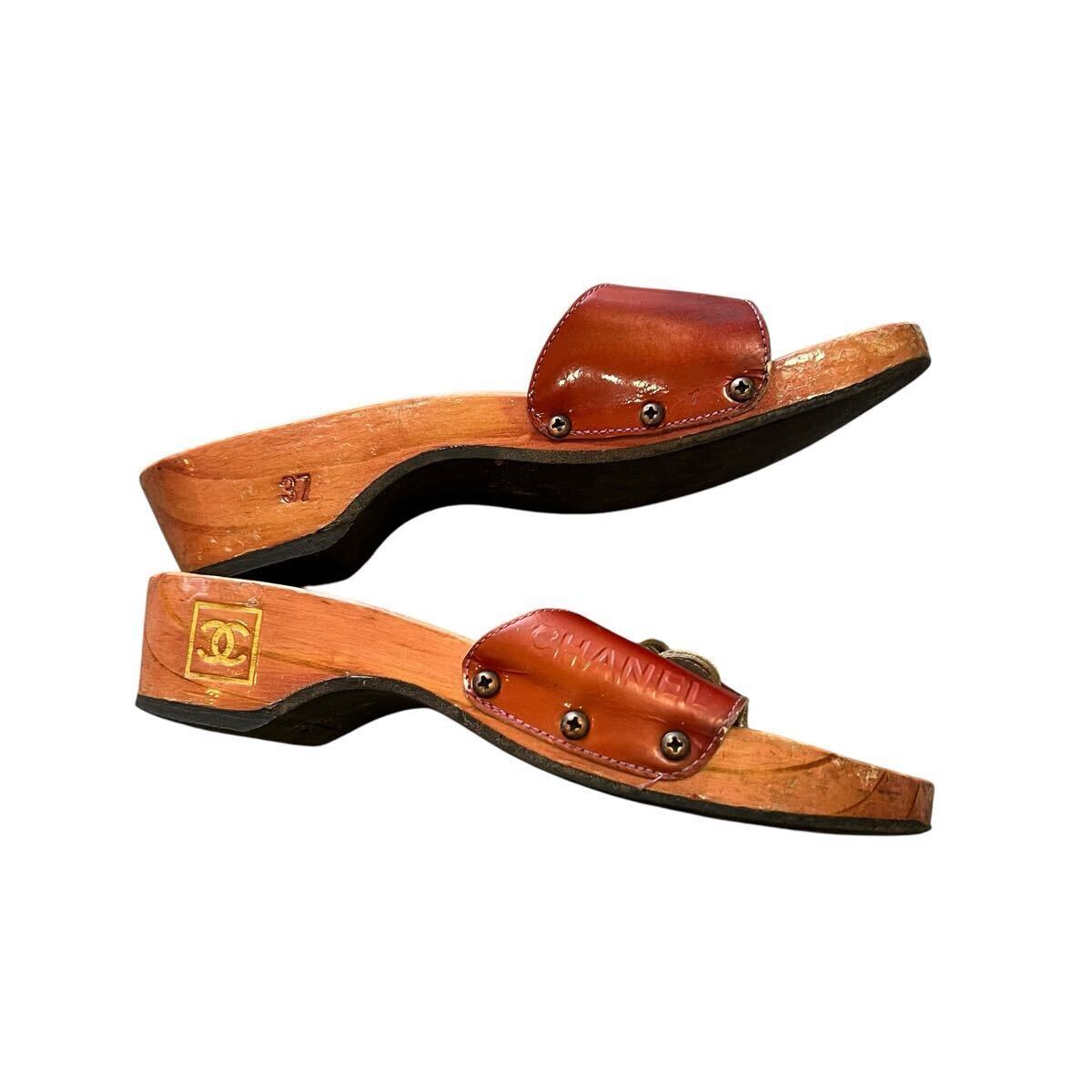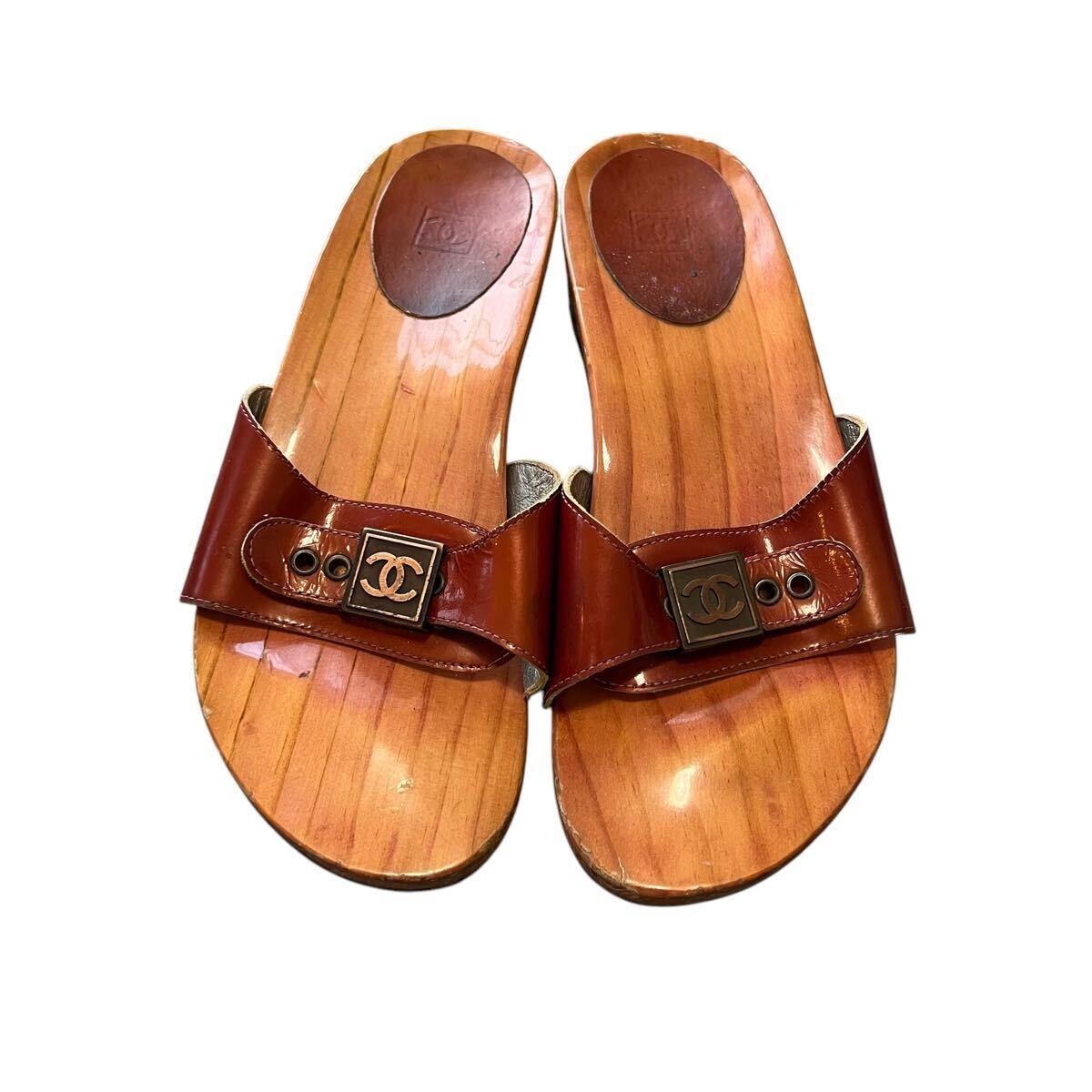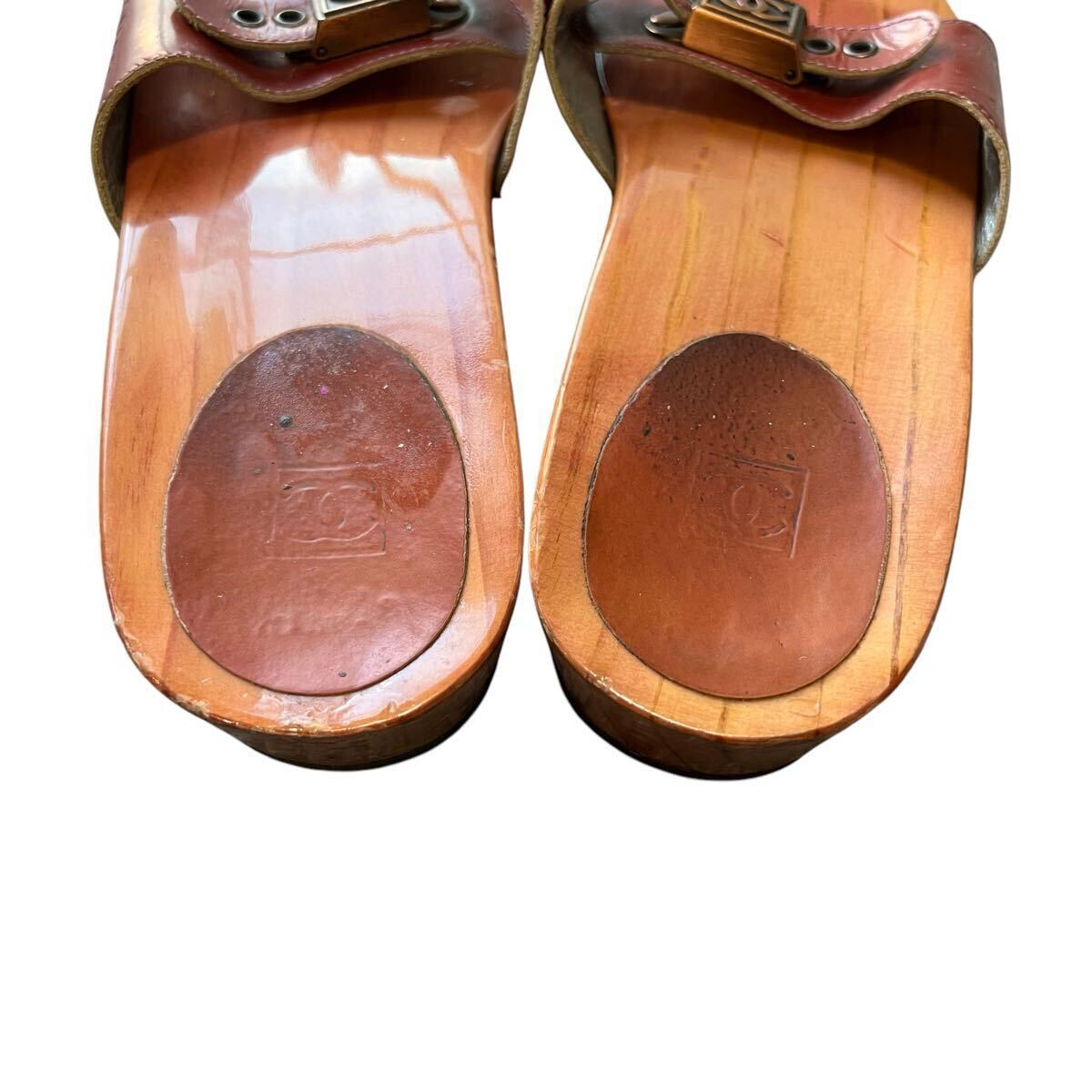 こちらはシャネルのロゴプレート付きウッドサンダルです。木材を使用したソールとレザーのアッパーのコンビネーションが、高級感とクラシックな魅力を演出しています。ゴールドカラーのロゴプレートとリベットディテールが、シャネルならではのアイコニックなデザインを際立たせています。2000年代初頭に多く見られたデザインで、リゾートウェアやカジュアルスタイルに最適です。アウトソールには適度な使用感がありますが、全体的な状態は良好です。