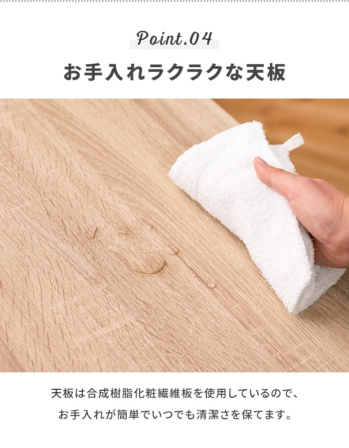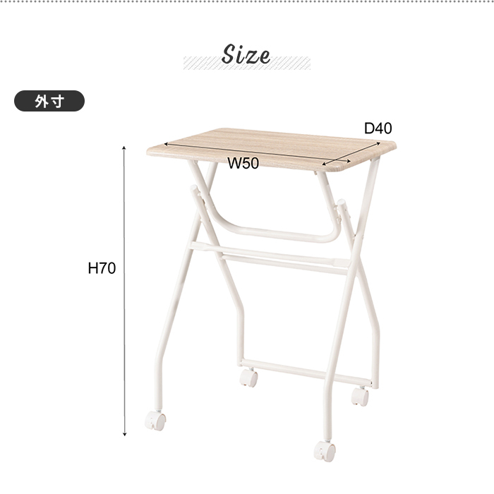 | 様々なシーンで活躍するフォールディングテーブル。 ちょっと作業スペースが欲しい時に、手軽に使える便利なテーブル。 キッチンの補助テーブル、簡易デスクや飾り場など、使い方は様々。 折り畳んだ時に自立するので、使わないときはその場でコンパクトに収納可能。 キャスター付きなのでちょっとした移動もスムーズに。 キャスターにはストッパーが付いているので、しっかり固定させて使うことも可能。 天板は合成樹脂化粧繊維板を使用しているので、お手入れが簡単でいつでも清潔。 |