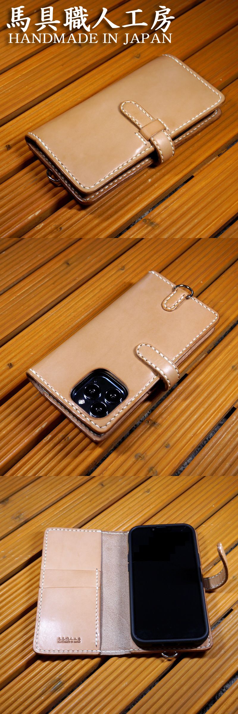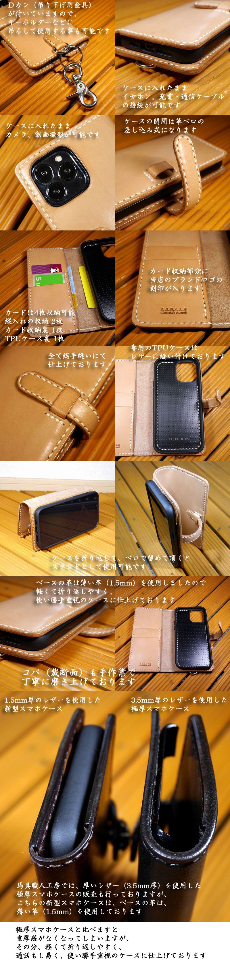 馬具職人工房では、厚いレザー(3.5mm厚)を使用した極厚スマホケースの販売も行っておりますが、こちらの新型スマホケースは、ベースの革は、薄い革(1.5mm)を使用しております