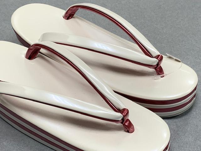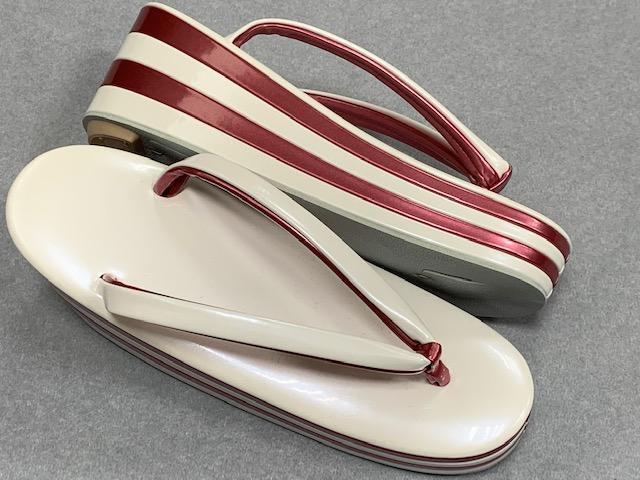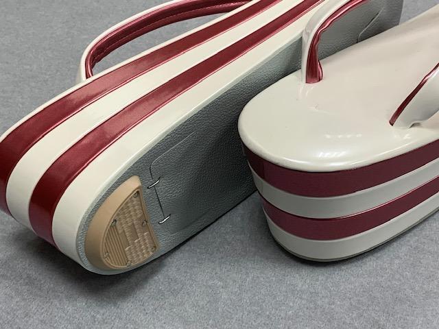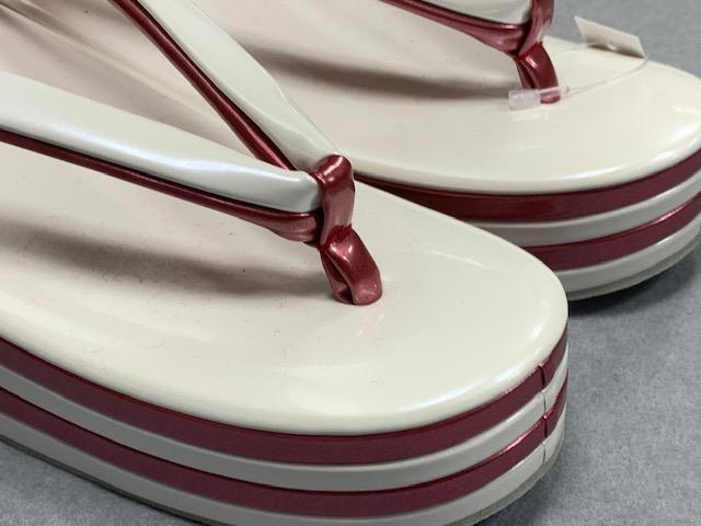★オフホワイトの台にワインのライン鼻緒。 シンプルで上品なツートンカラーがが映えて、とてもステキです。 4枚芯で、かかとの高さは7.5cmになります。